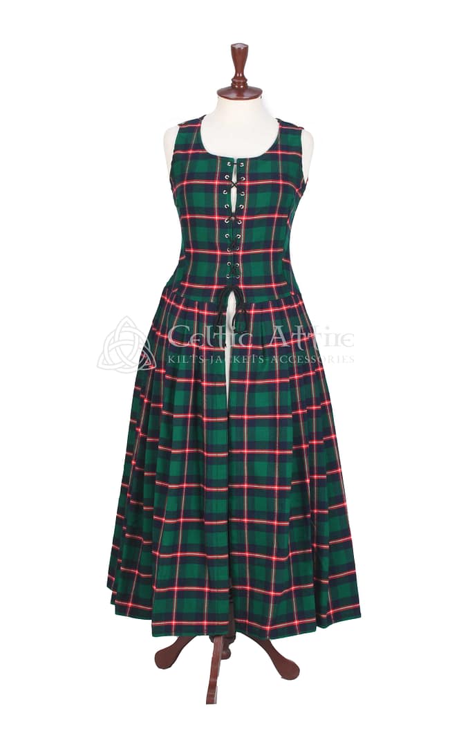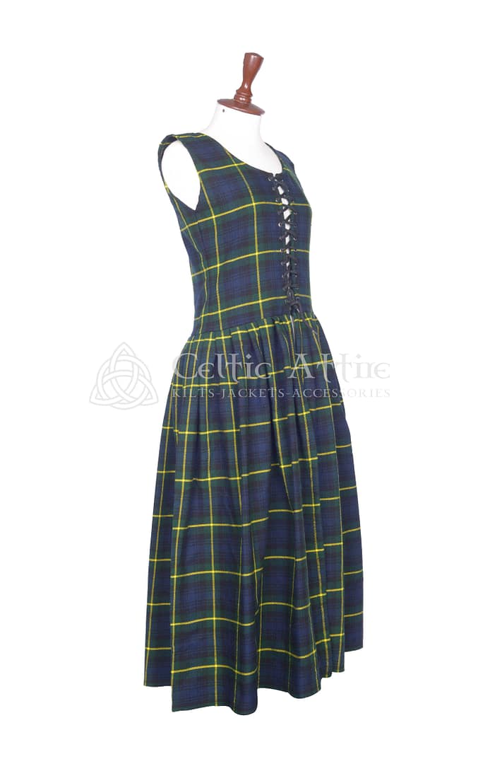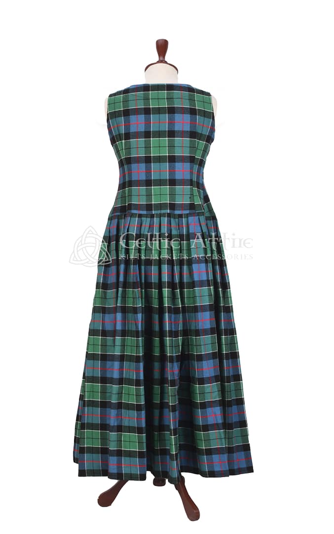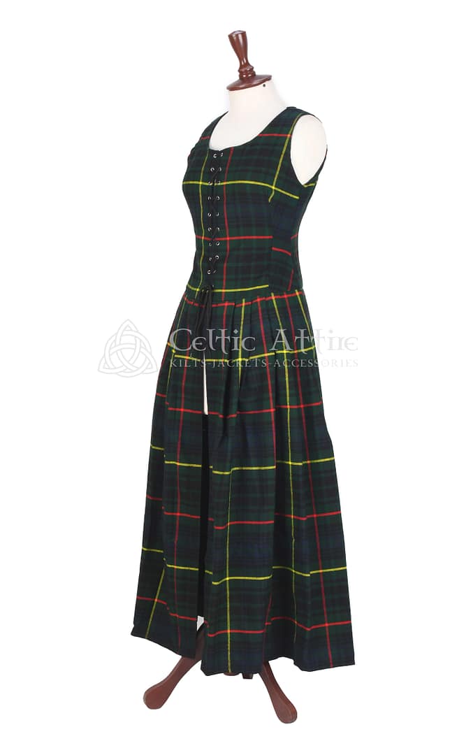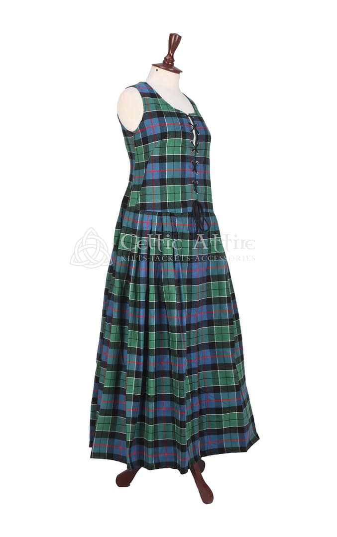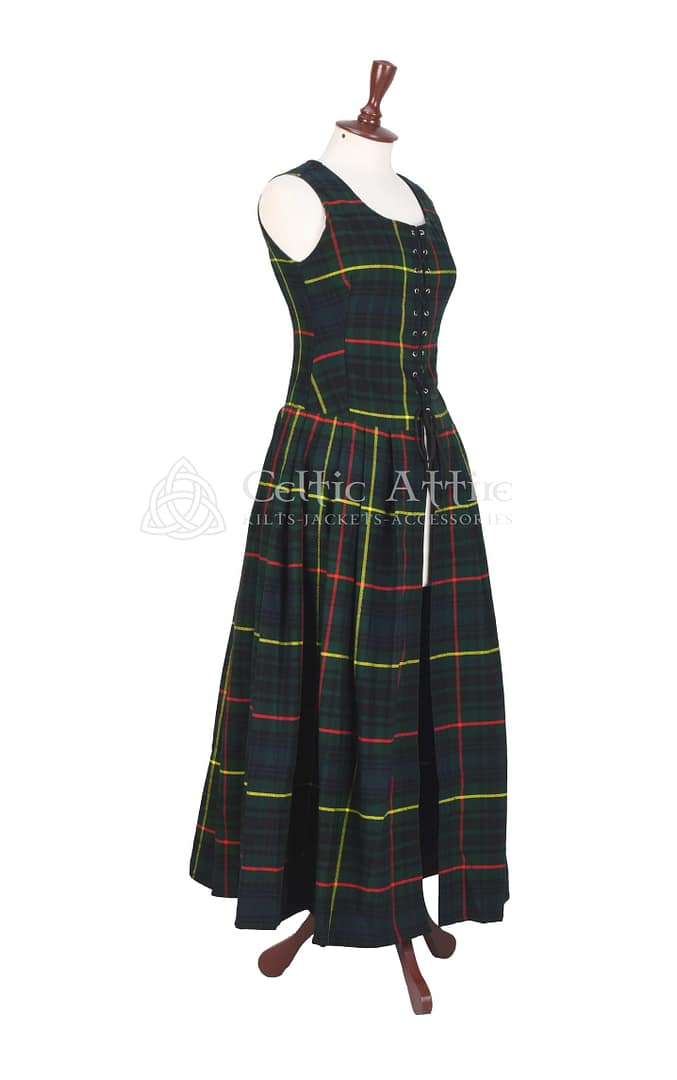 We make this gown from the elegant Hunting Stewart tartan, woven in deep greens, blues, and reds. The pattern honors the royal Stewart clan and suits formal events, historical reenactments, and Highland gatherings. It’s bold, beautiful, and deeply rooted in Scottish identity.