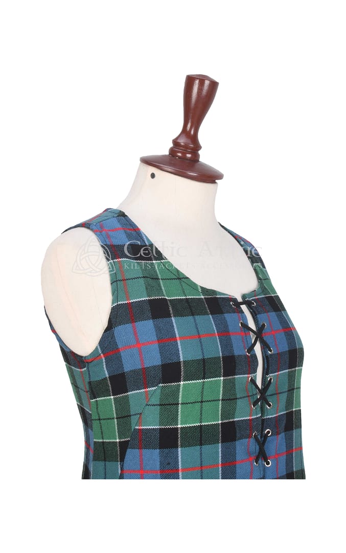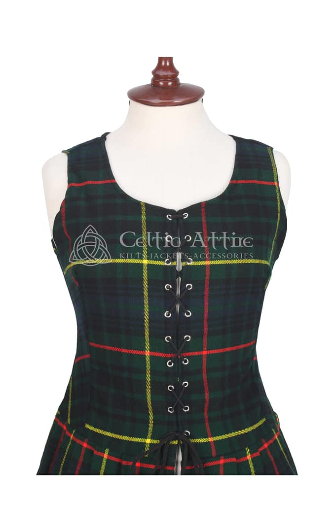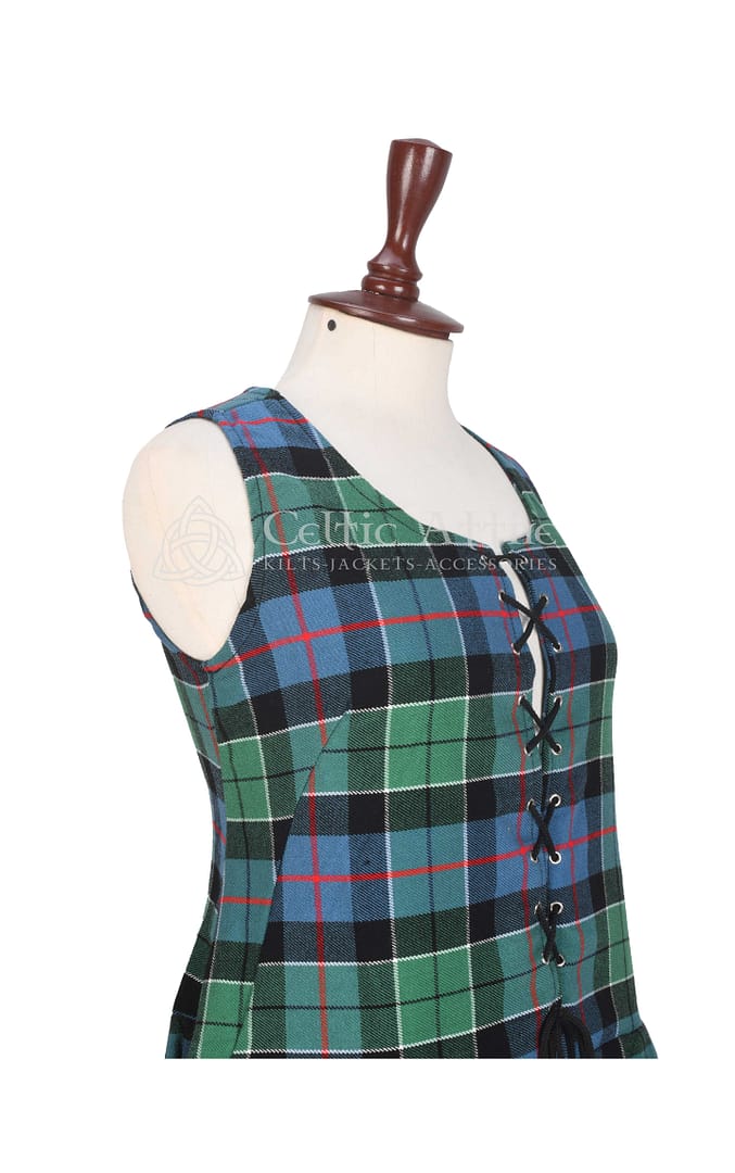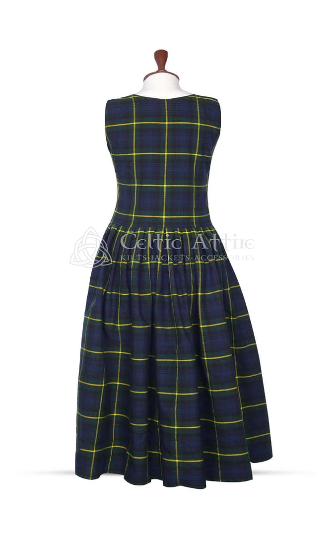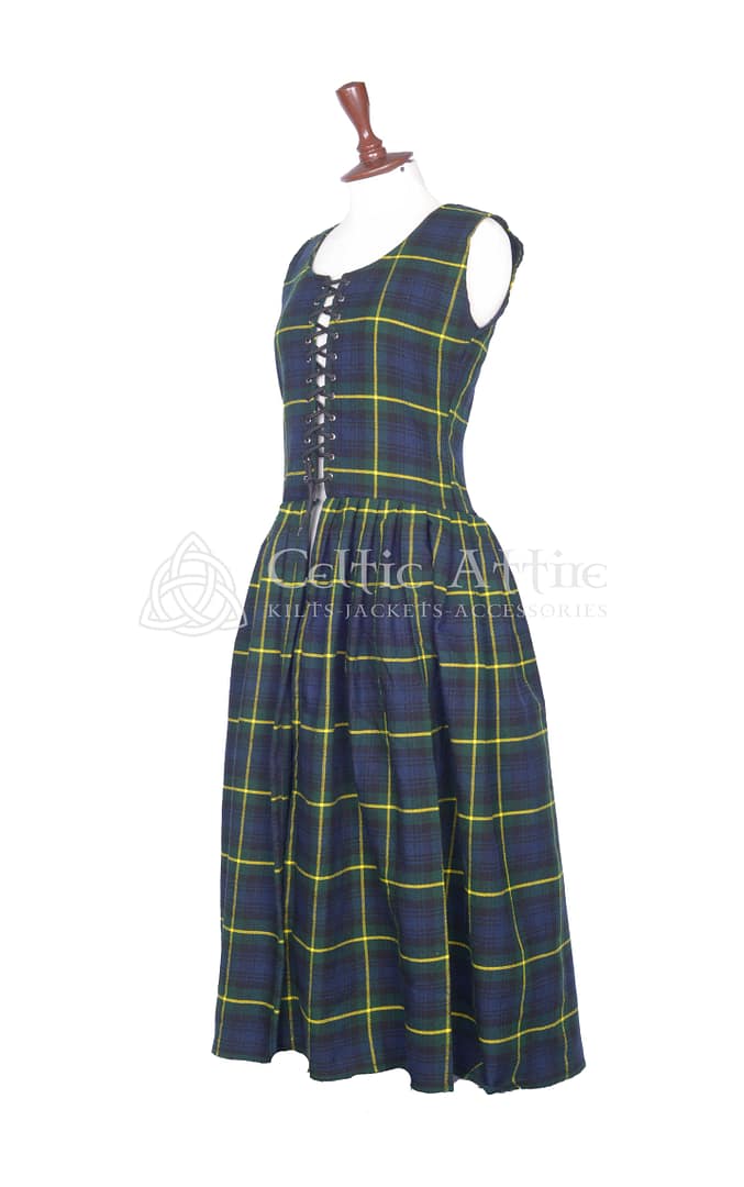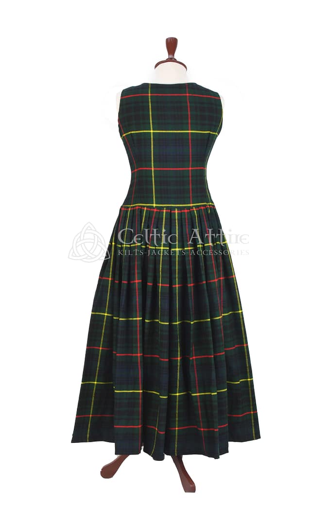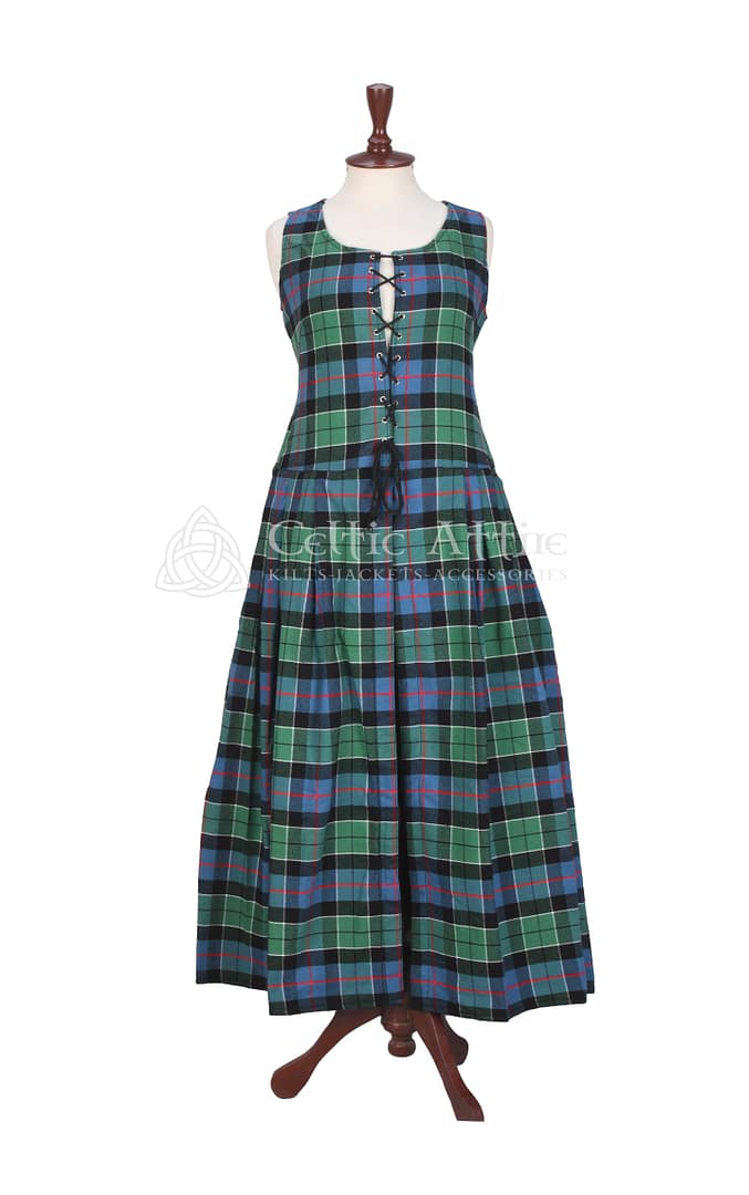 We make this gown from the elegant Hunting Stewart tartan, woven in deep greens, blues, and reds. The pattern honors the royal Stewart clan and suits formal events, historical reenactments, and Highland gatherings. It’s bold, beautiful, and deeply rooted in Scottish identity.