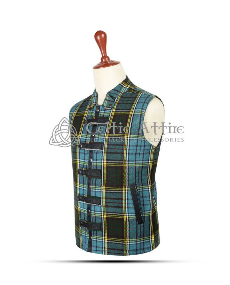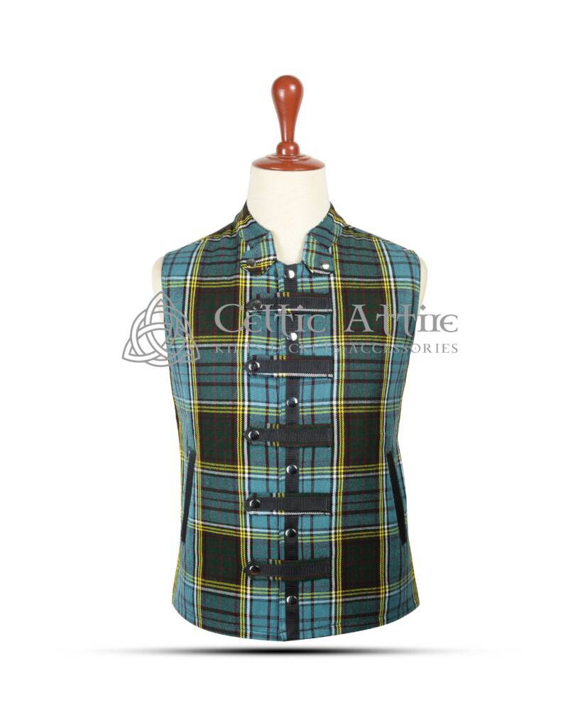 Crafted from premium Anderson tartan fabric, this waistcoat showcases striking colors and classic checks with a contemporary edge. The tailored cut creates a sharp silhouette, while punk-inspired styling adds attitude and character. This unique blend of tradition and rebellion makes it a powerful piece for expressive fashion.