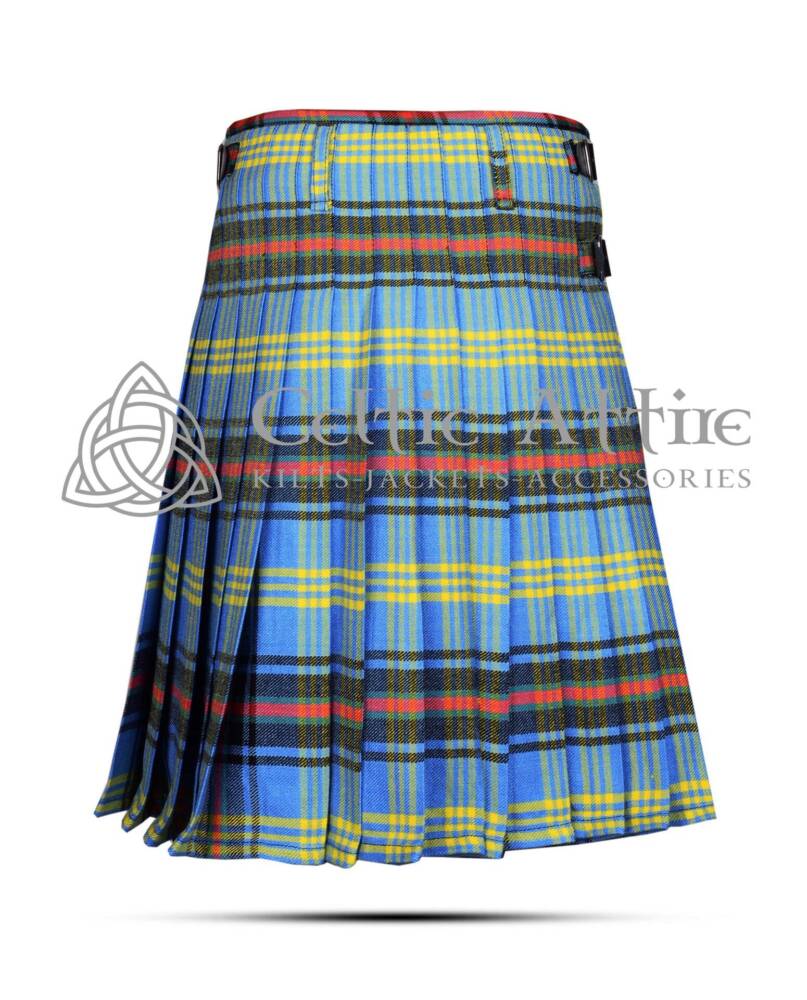 The design includes deep knife pleats that allow for ease of movement, making it ideal for dancing or active wear. The pleats are sewn down at the hips, creating a sleek silhouette. Genuine leather straps and rust-free buckles secure the kilt, ensuring it remains stylish and functional.