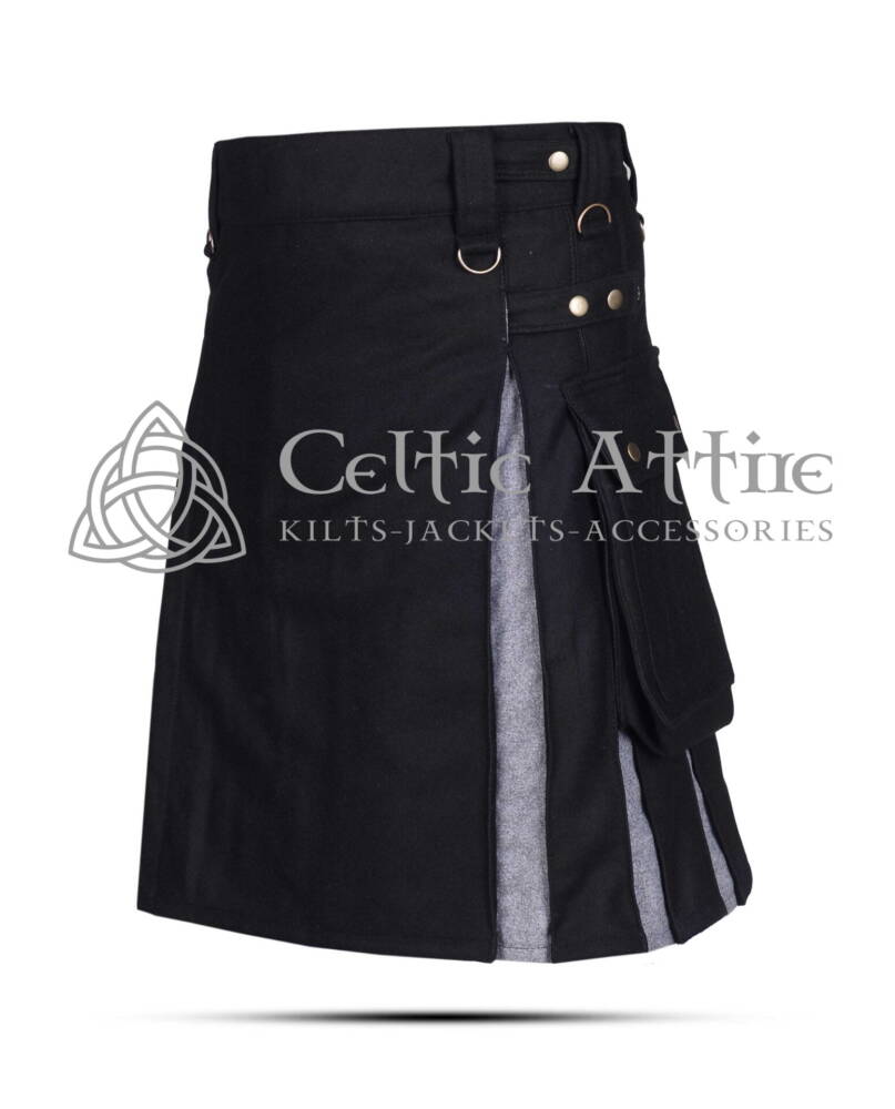 The Hybrid Wool Utility Kilt is designed for everyday wear. It includes large cargo pockets on both sides, providing ample space for carrying essentials. Whether you’re at a festival or enjoying a casual day out, this kilt keeps your belongings secure and accessible. The black and gray color scheme adds a contemporary touch, making it versatile enough to pair with various outfits.