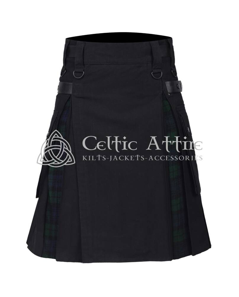 The Black Cotton and Black Watch Tartan Hybrid Kilt is a perfect fusion of traditional Scottish heritage and modern utility design. Crafted from premium quality cotton fabric combined with authentic Black Watch tartan, this hybrid kilt delivers exceptional comfort, durability, and timeless style. Designed for versatility, it is ideal for casual wear, outdoor activities, festivals, Highland games, and everyday use.