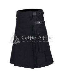 This hybrid kilt features a solid black cotton body with traditional tartan pleats, creating a bold and stylish contrast. The heavy-duty cotton fabric ensures long-lasting performance, while the breathable material keeps you comfortable throughout the day. The pleated tartan back allows excellent freedom of movement, making it perfect for active lifestyles.