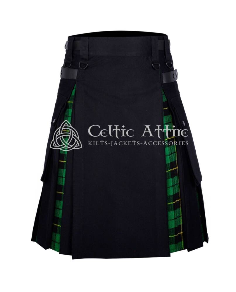 The Black Cotton Wallace Hunting Hybrid Utility Kilt is a perfect blend of tradition and modern utility. Crafted from high-quality black cotton, this kilt offers exceptional comfort and durability, making it ideal for both everyday wear and special occasions. The classic Wallace Hunting tartan features deep greens, blacks, and hints of blue, adding a rich and sophisticated look.