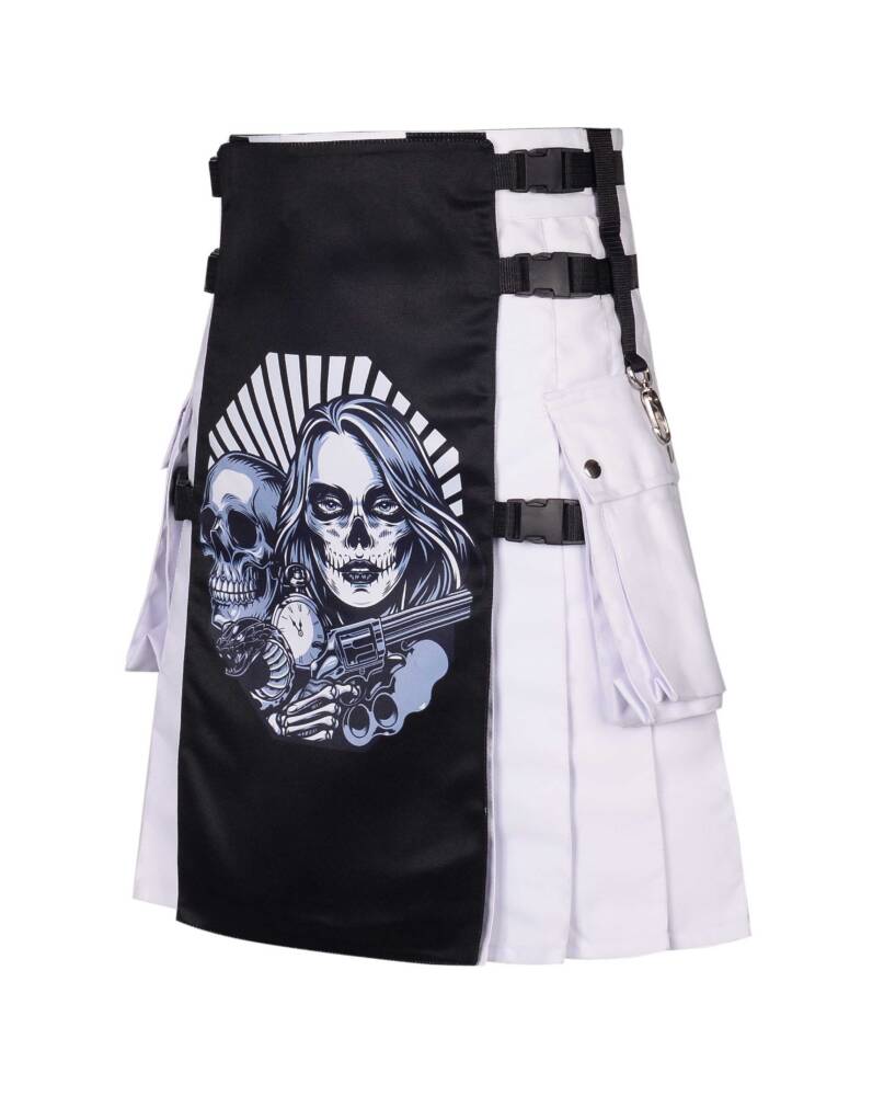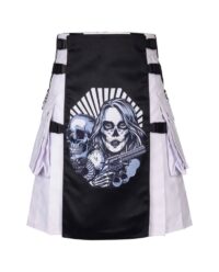 Each skull, intricately detailed and artfully arranged, adds a touch of dark elegance to the garment, creating a striking visual contrast against the deep black background. The sublimated printing technique ensures that the design remains vibrant and resistant to fading, promising longevity and durability for years to come. Whether worn for formal events or as a statement piece in alternative fashion ensembles, the Black Gothic Skull Sublimated Kilt exudes a sense of mystery and individuality, making it a captivating choice for those who embrace the darker side of style.