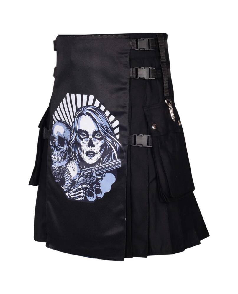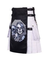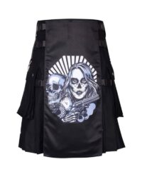 The Black Gothic Skull Sublimated Kilt is a captivating synthesis of macabre aesthetics and traditional Scottish craftsmanship. Crafted from premium materials, its jet-black fabric serves as a canvas for an intricate sublimated print featuring haunting skull motifs, reminiscent of Gothic architecture and dark symbolism. This kilt reimagines the classic Scottish garment with a contemporary edge, blending the timeless silhouette of pleats and wrap-around design with an avant-garde twist.
