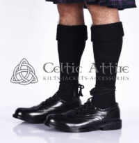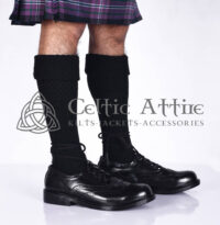 Pair these socks with your favorite kilt, ghillie brogues, and sporran for a complete Highland look that honors tradition while embracing modern comfort. Perfect for Scotsmen, heritage enthusiasts, or anyone looking to add a touch of elegance to their attire, our Black Kilt Socks are a versatile and essential addition to your collection.