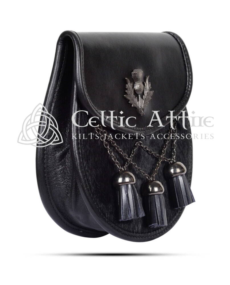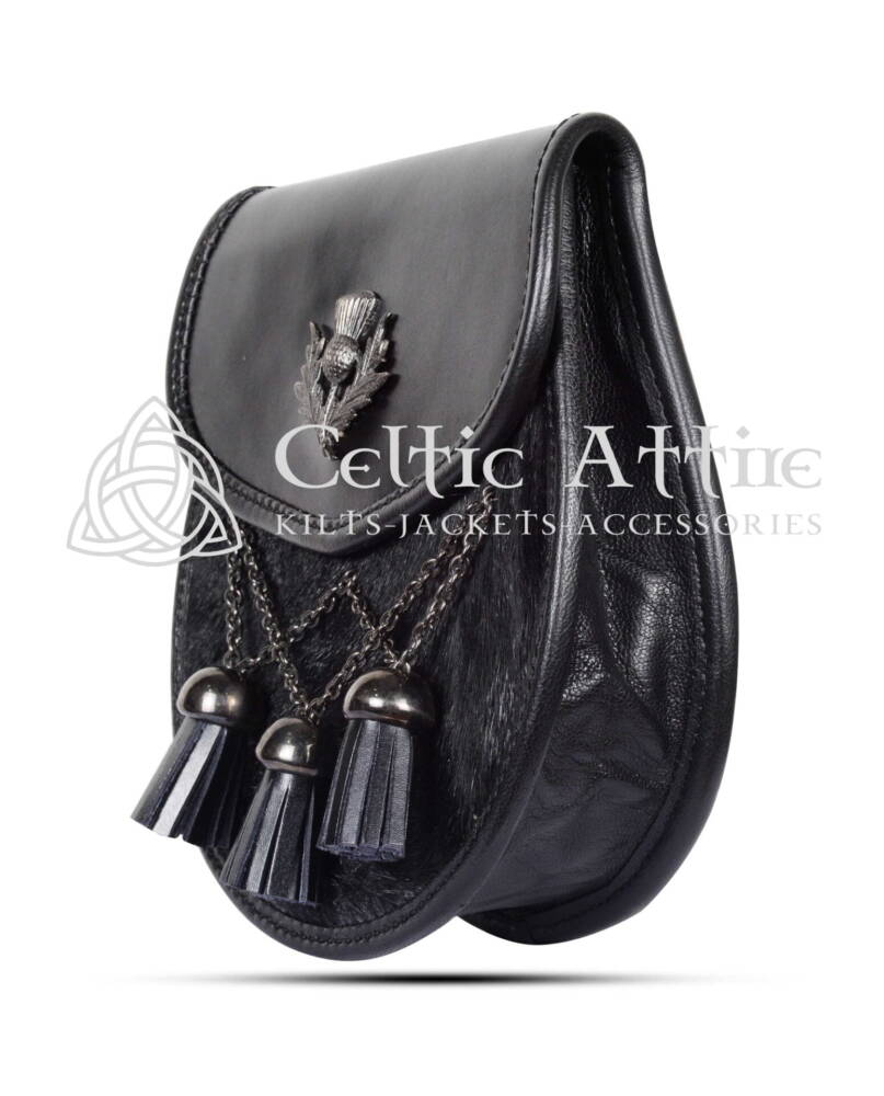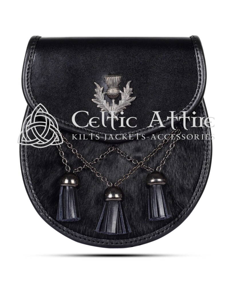 Elevate your Scottish attire with the Cross Tassels Bovine Sporran, a perfect blend of elegance and tradition. Crafted from luxurious bovine fur, premium grade real leather and thistle emblem this sporran offers a rugged and elegant texture that enhances the overall sophistication of your ensemble. The striking contrast of the V-Cross tassels against the leather body creates a visually appealing accessory that complements any kilt. Adorned with ornate chrome 3 tassel balls, it’s elegance strikes as a symbol of Scottish pride and resilience. This sporran is not only stylish but also rich in cultural significance. Semi Dress Sporrans are popular as you can wear them at formal or informal Scottish events or even as daily wear.