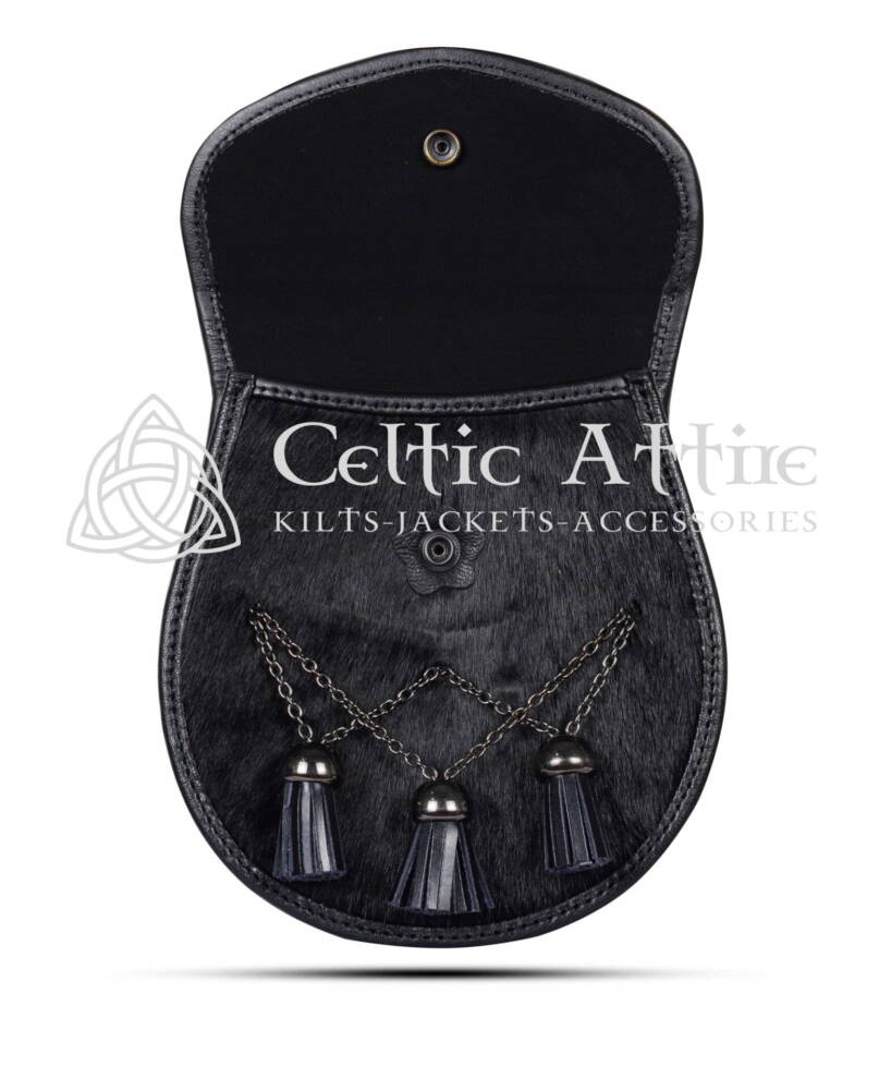 Designed for versatility, the Cross Tassels Bovine Sporran features three decorative black leather tassels with metal chains, adding movement and flair to your look. Measuring 7″ x 9″, it provides ample space for your essentials while maintaining a compact silhouette. Whether you’re attending a wedding, a festive celebration, or a formal event, the Black Rabbit Fur Sporran is the ideal accessory to complete your outfit with a touch of Scottish charm and elegance.