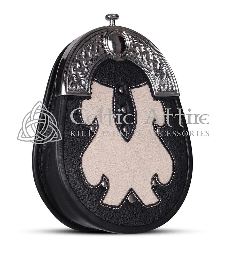 Black Leather Hunting Sporran – White Fur Silver Cantle