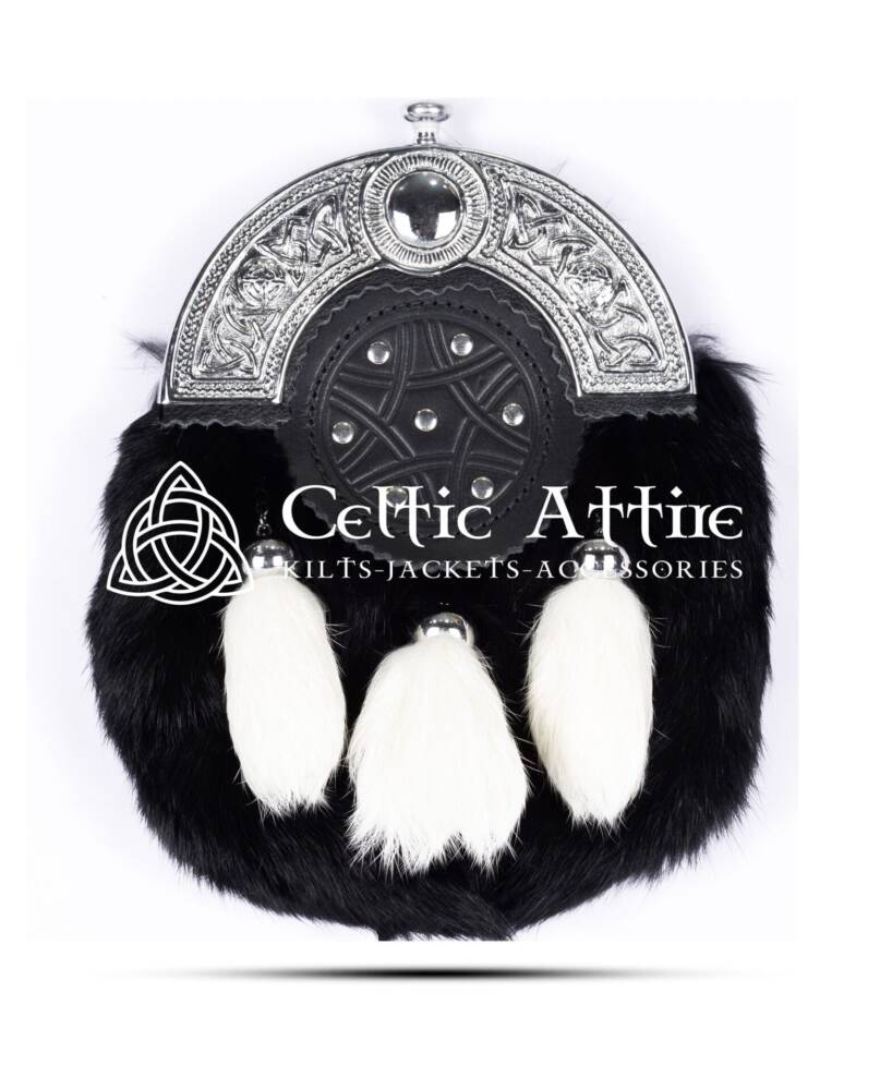 This exquisite Black Rabbit Fur Full Dress Sporran with White Tassels is a stunning accessory that enhances any traditional Scottish outfit. Crafted from high-quality rabbit fur, the sporran contrasts the deep black body and the elegant white tassels, creating a visually appealing design. The chrome Celtic cantle adds a touch of sophistication, symbolizing rich cultural heritage. With its durable leather backing and included chain strap, this sporran looks great and provides practicality, making it ideal for formal gatherings, special occasions, or everyday use.