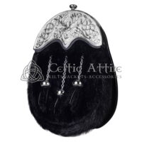 The Black Seal Dress Sporran is a stunning addition to any Highland outfit. This full dress sporran features luxurious black seal fur, providing a rich texture and a sophisticated appearance. The highlight of this sporran is its striking silver cantle. The cantle showcases a beautifully crafted stag’s head, symbolizing strength and nobility. This design adds an elegant touch, making it perfect for formal occasions.