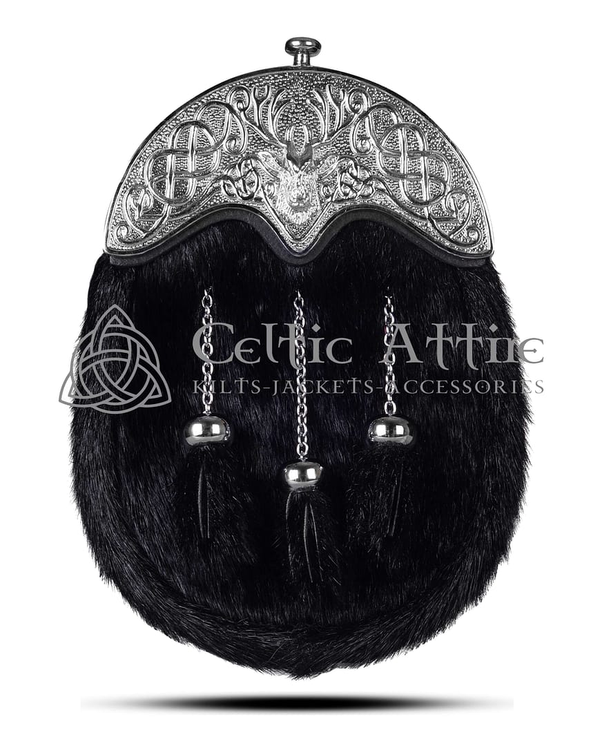 Black Seal Fur Full Dress Sporran Stag Head Silver Cantle