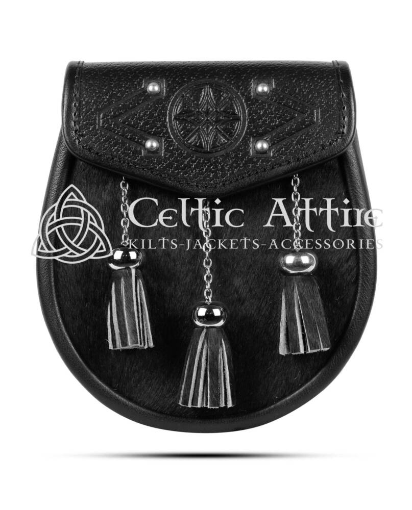 Elevate your Scottish attire with the Real Leather Scottish Semi Dress Black Seal Fur Sporran, a perfect blend of elegance and tradition. Crafted from luxurious black seal fur, this sporran offers a soft and plush texture that enhances the overall sophistication of your ensemble. The striking contrast of the black seal fur against the black leather body creates a visually appealing accessory that complements any kilt. Adorned with ornate chrome 3 tassel balls, it’s elegance strikes as a symbol of Scottish pride and resilience. This sporran is not only stylish but also rich in cultural significance. Semi Dress Sporrans are popular as you can wear them at formal or informal Scottish events or even as daily wear.