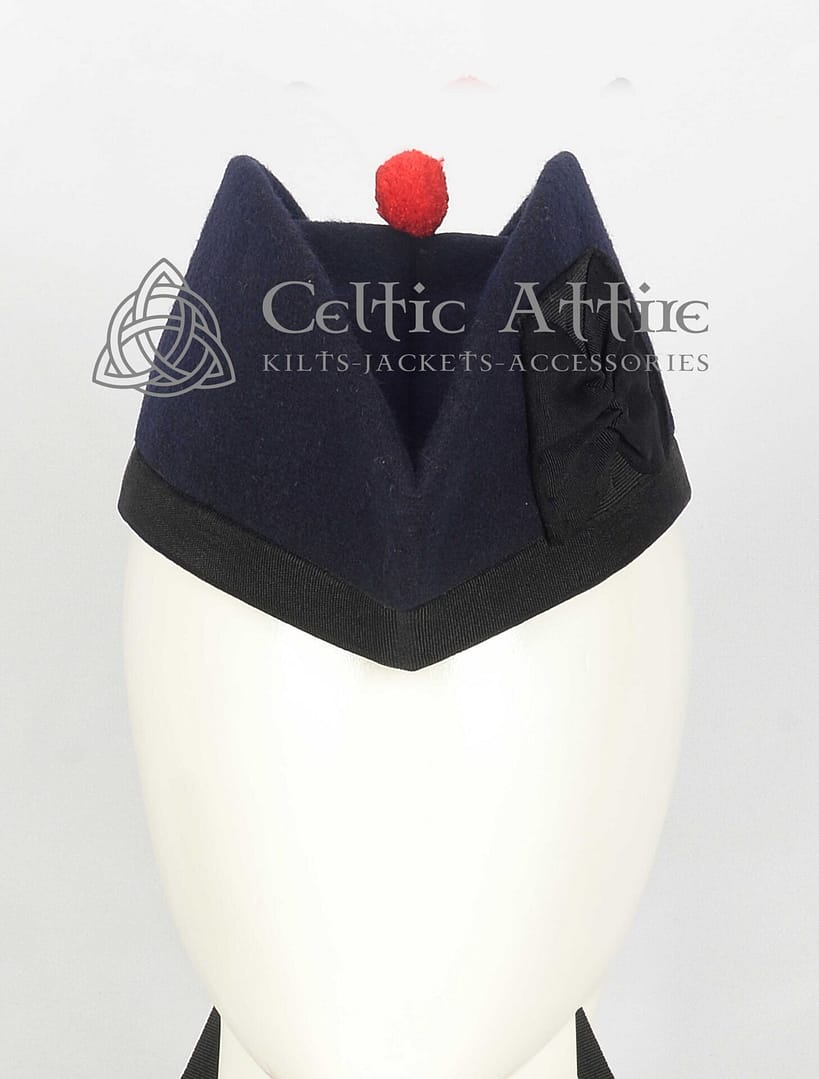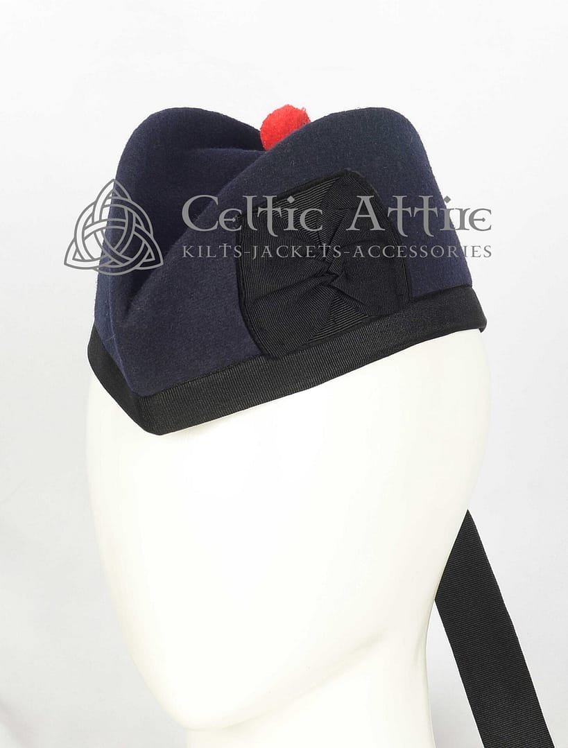 Black Watch Glengarry “Ladies from Hell” used Dark Blue crown and body with red toorie, the Black Watch did not use a diced band. Celtic Attire offers the widest range of Scottish Balmoral Bonnets, Glengarry Hats, Irish Caubeen Caps, and Tammie Hats Here.