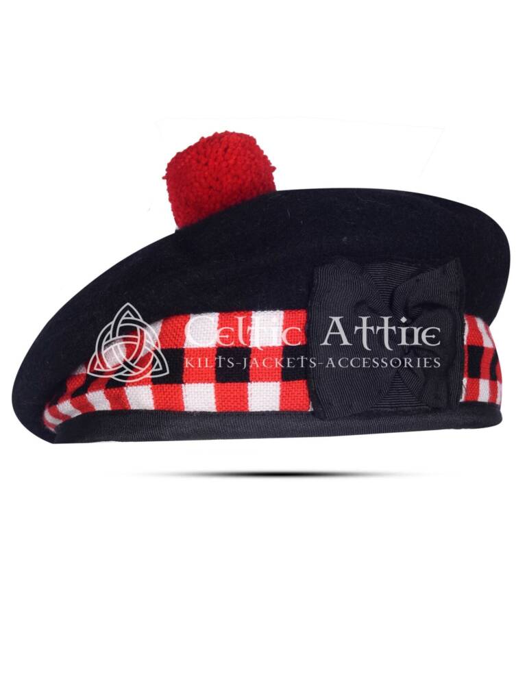 Black Wool Balmoral Cap Scottish Military Diced Barret Bonnet