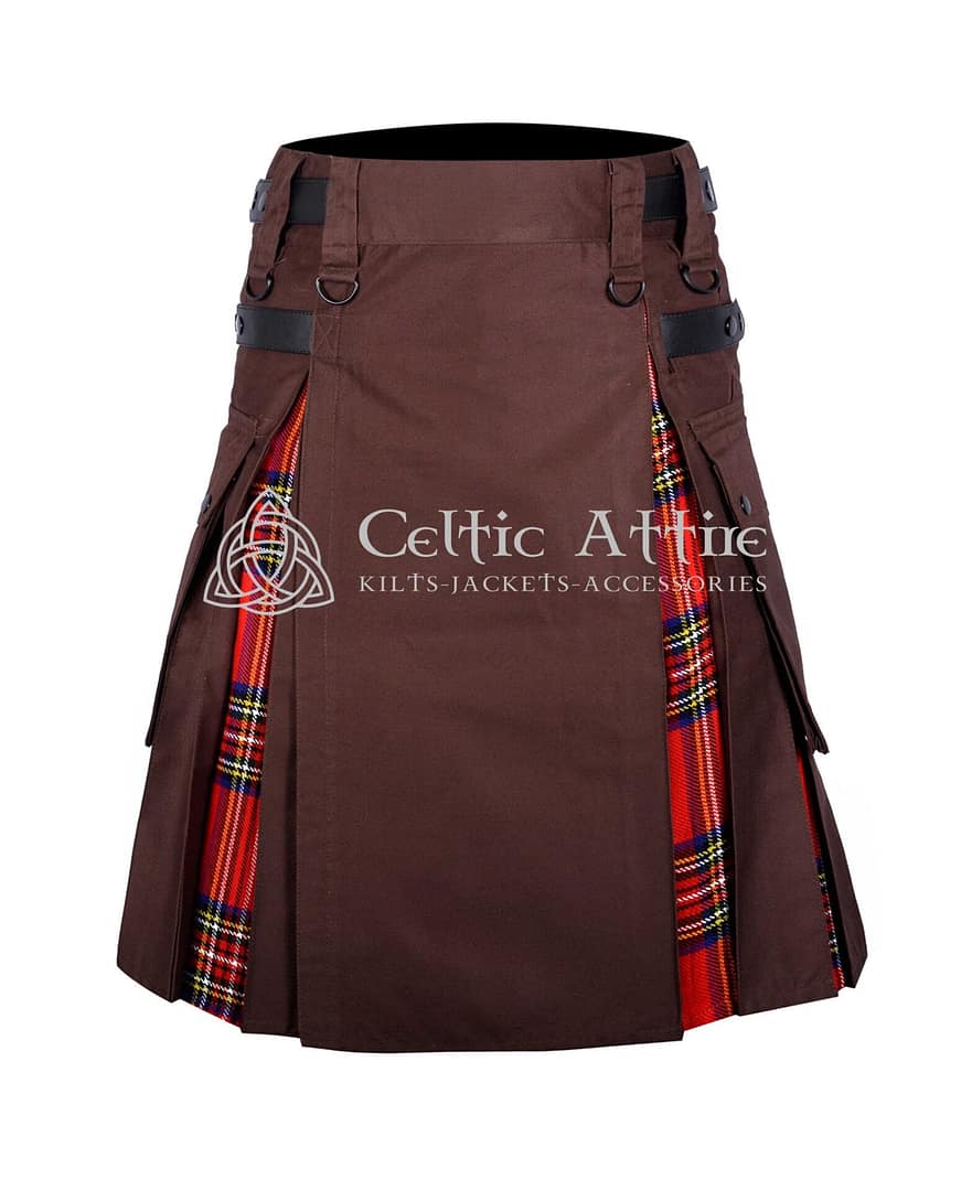 The Brown Cotton Stewart Royal Tartan Hybrid Utility Kilt is a stunning blend of tradition and practicality. Crafted from high-quality brown cotton, this kilt provides both comfort and durability, making it perfect for everyday wear as well as special occasions. The elegant Stewart Royal tartan pattern, featuring rich blues and greens, beautifully contrasts with the warm brown fabric, creating a sophisticated look.