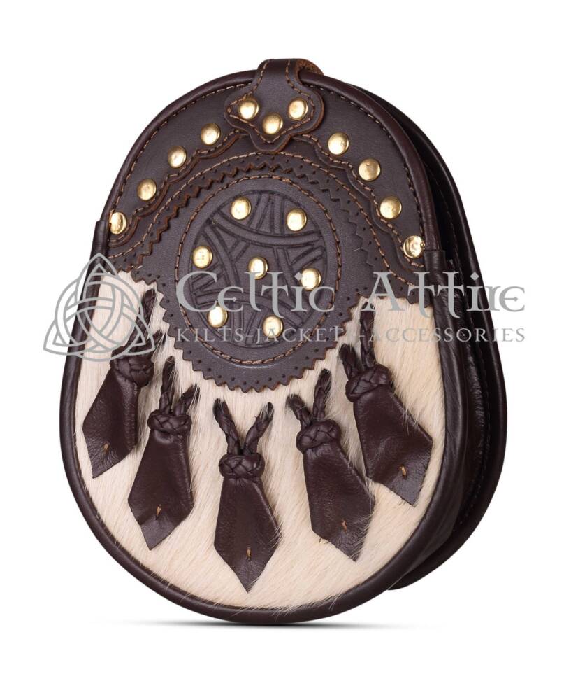 Brown Leather Hunting Sporran – White Fur and 5 Tassels