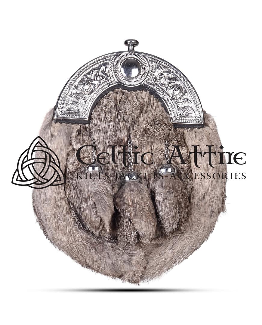Each sporran is designed with a beautiful chrome cantle. The cantle often showcases intricate Celtic designs, enhancing its classic appeal. This sporran includes three matching tassels that dangle gracefully, adding movement and charm to your look.The Brown Rabbit Fur Full Dress Sporran is not just about aesthetics. It is practical and functional. It comes with a standard fitting sporran chain, allowing for easy wear. The chain ensures that the sporran sits comfortably at your waist, perfectly complementing your kilt. The spacious interior provides ample room for carrying essentials, making it suitable for various occasions.