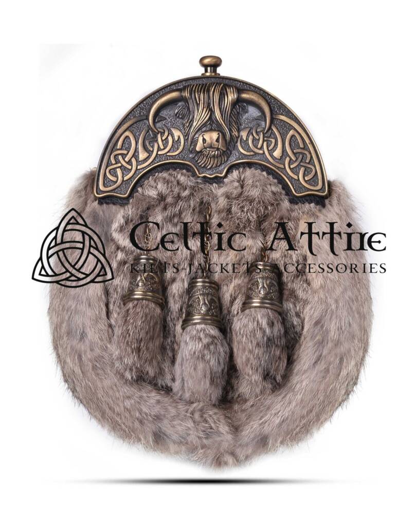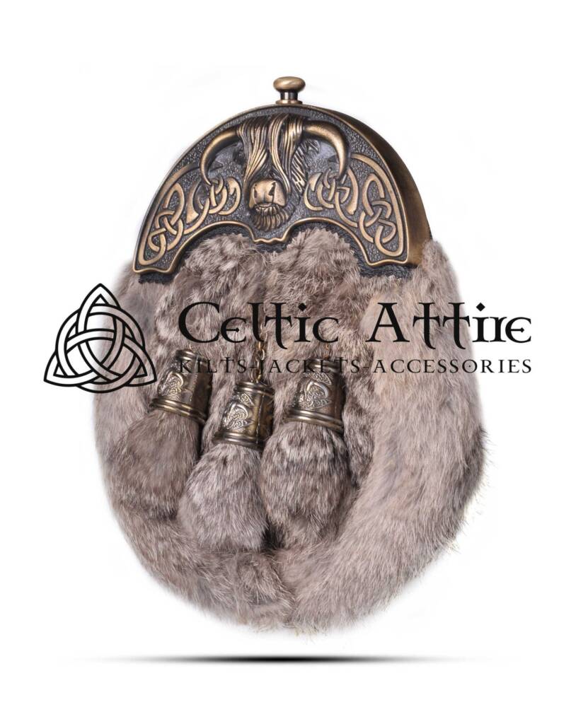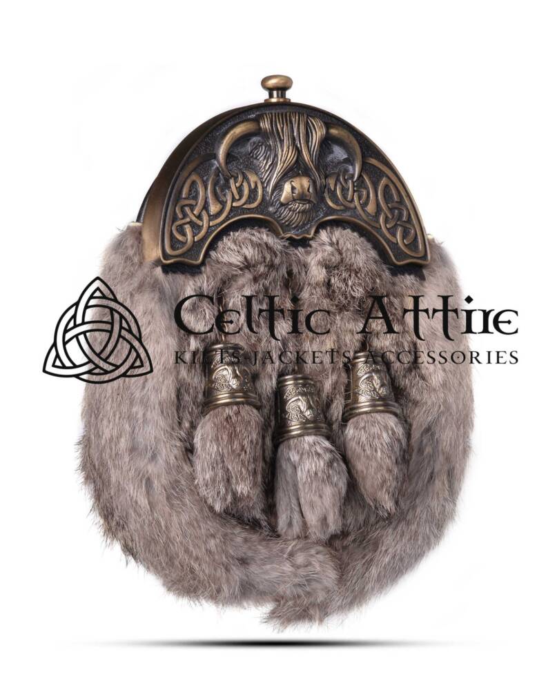 Crafted with attention to detail, the sporran includes three matching capped tassels that hang from antique finish chains. These tassels enhance the sporran’s visual appeal while adding a touch of movement. The pouch is backed with high-quality leather and features a secure stud fastening. This ensures that your belongings remain safe and accessible during events. The Brown Rabbit Fur Full Dress Sporran is ideal for weddings, graduations, and other formal gatherings where traditional Scottish dress is appropriate.