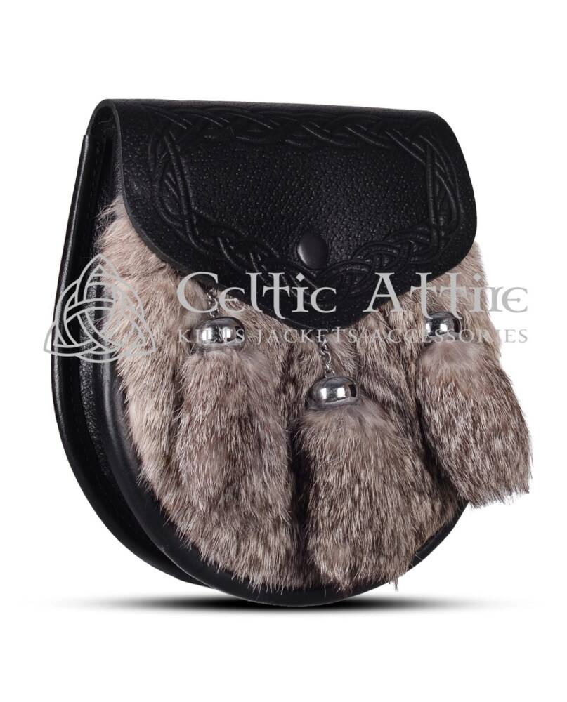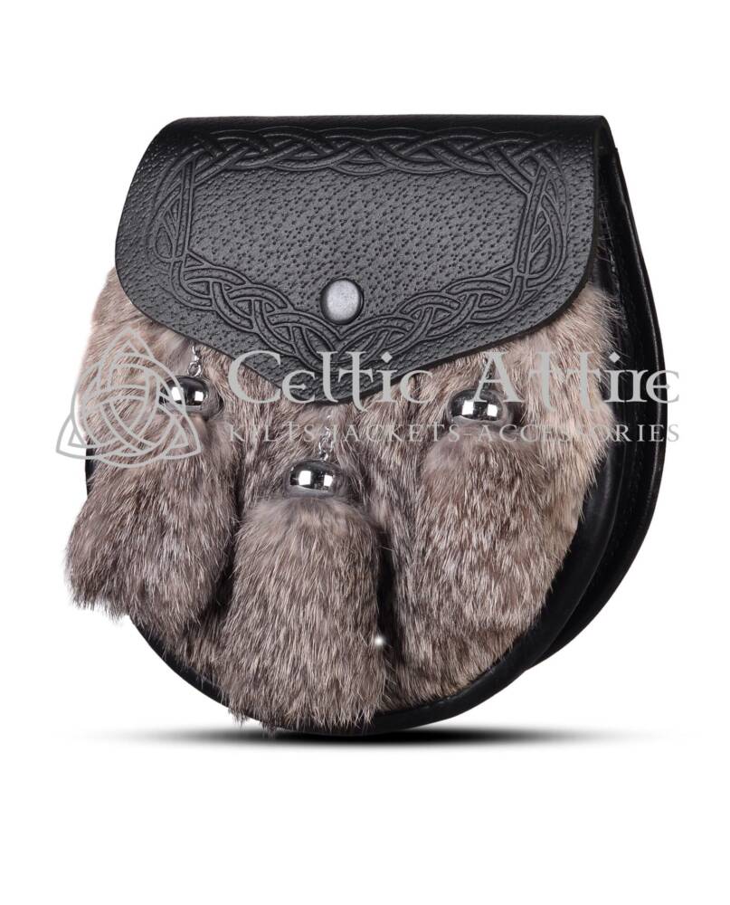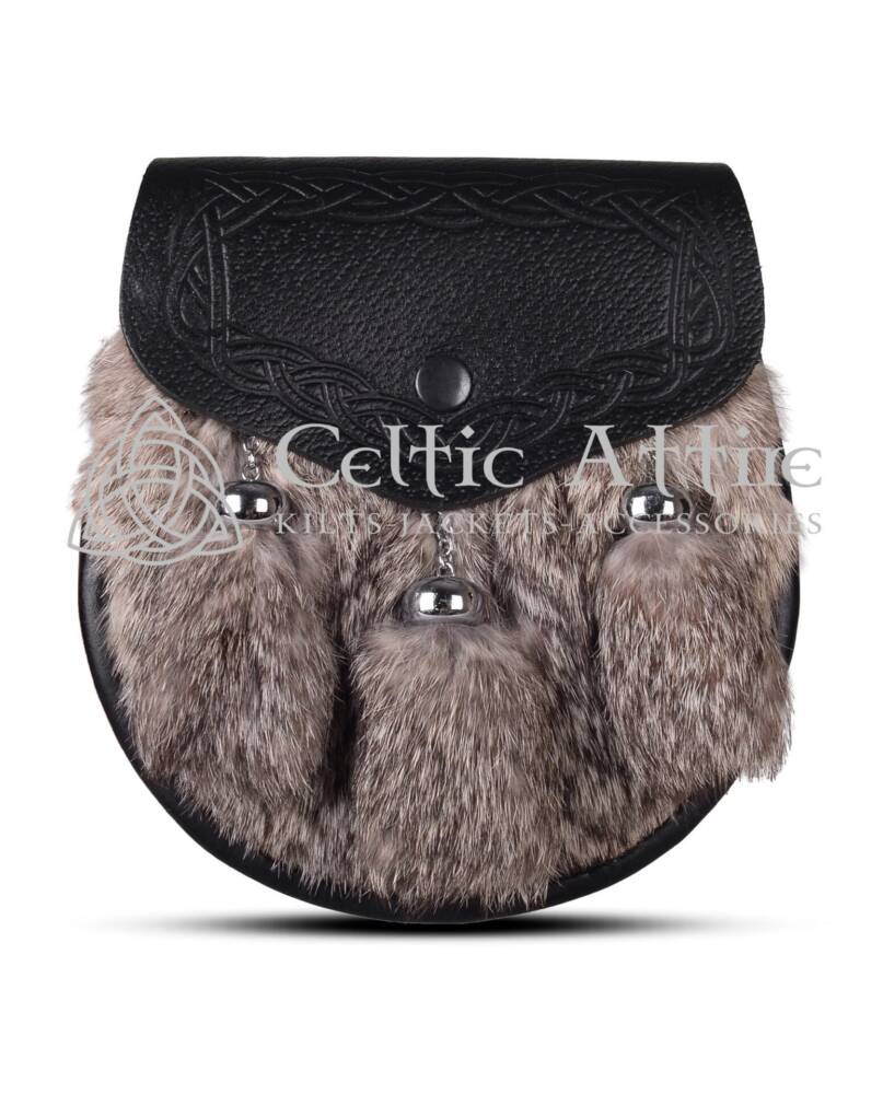 Elevate your Scottish attire with the Real Leather Scottish Semi Dress Brown Rabbit Fur Sporran, a perfect blend of elegance and tradition. Crafted from luxurious rabbit fur, this sporran offers a soft and plush texture that enhances the overall sophistication of your ensemble. The striking contrast of the black fur against the leather body creates a visually appealing accessory that complements any kilt. Adorned with ornate chrome 3 tassel balls, it’s elegance strikes as a symbol of Scottish pride and resilience. This sporran is not only stylish but also rich in cultural significance. Semi Dress Sporrans are popular as you can wear them at formal or informal Scottish events or even as daily wear.