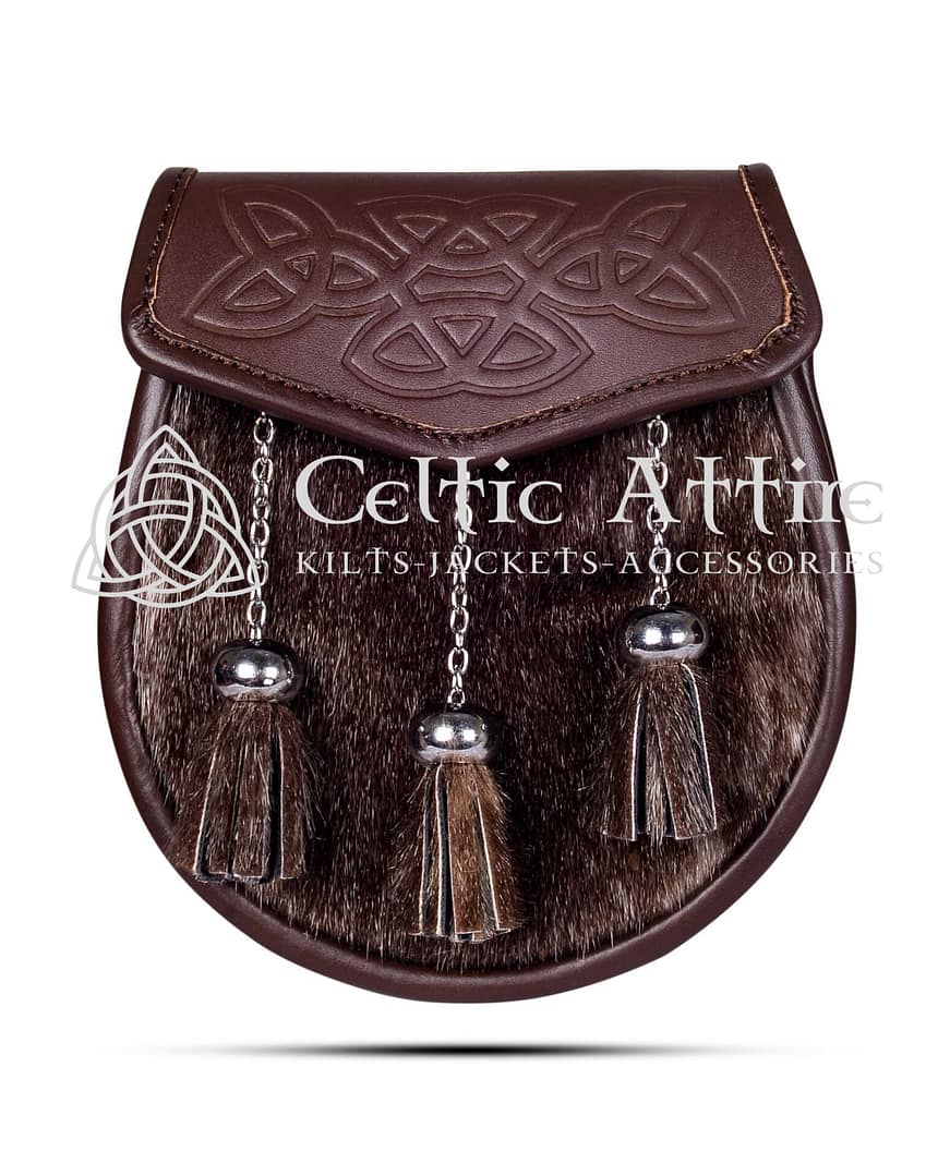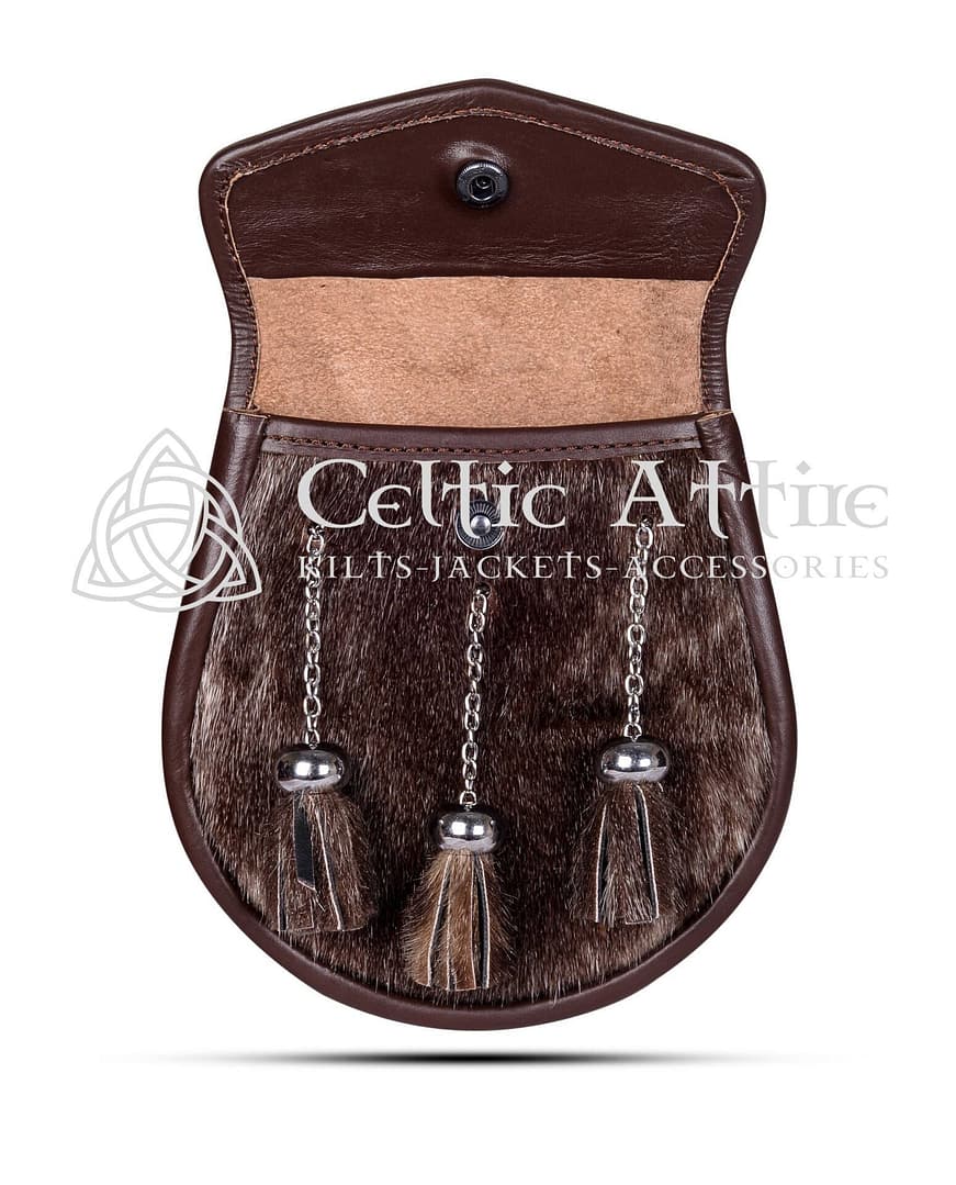 Elevate your Scottish attire with the Real Leather Scottish Semi Dress Brown Leather Seal Sporran, a perfect blend of elegance and tradition. Crafted from luxurious natural color seal fur, this sporran offers a soft and plush texture that enhances the overall sophistication of your ensemble. The striking contrast of the natural seal fur against the brown leather body creates a visually appealing accessory that complements any kilt. Adorned with ornate chrome 3 tassel balls, it’s elegance strikes as a symbol of Scottish pride and resilience. This sporran is not only stylish but also rich in cultural significance. Semi Dress Sporrans are popular as you can wear them at formal or informal Scottish events or even as daily wear.