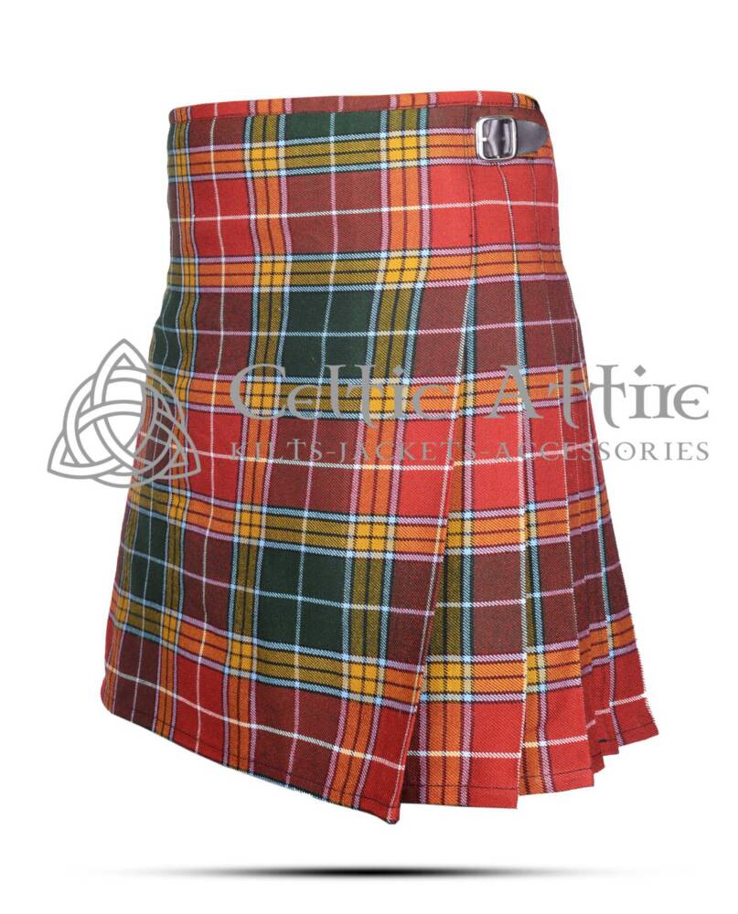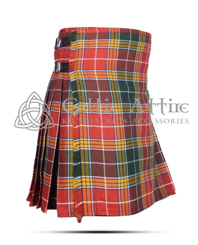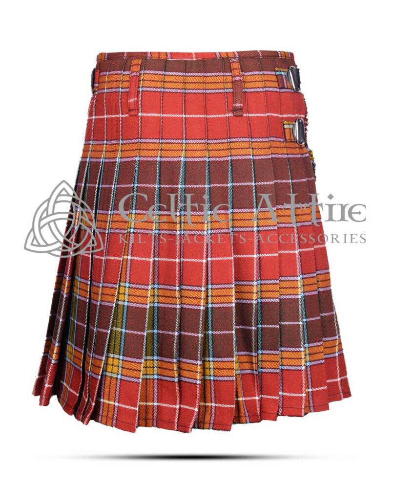 The Buchanan Tartan 8 Yard Kilt includes adjustable leather straps and rust-free buckles, ensuring a secure and customizable fit. You can easily adjust the waist to your preference, providing comfort throughout the day. The kilt is also fully lined to prevent chafing, making it ideal for all-day wear.