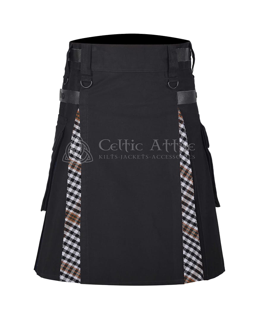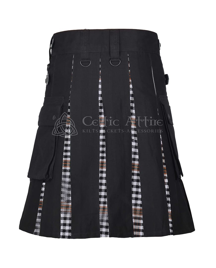 Designed with utility in mind, it features deep detachable cargo pockets on both sides—perfect for carrying tools, gear, or daily essentials. Heavy-duty belt loops support utility belts or accessories, while adjustable leather straps and a snap front closure provide a secure, customized fit. The pleated tartan back keeps the traditional look alive, while the solid black front adds a tough, tactical aesthetic.