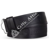 Discover the timeless elegance of our Celtic Knots and Circle Embossed Black Leather Kilt Belt. Crafted from high-quality black leather, this belt features intricate Celtic knotwork patterns and embossed circles, symbolizing unity and eternity in Celtic art. Complete with a Celtic-style buckle in polished metal, it’s designed to complement traditional Scottish attire like kilts, adding a touch of heritage and style to any outfit. Ideal for formal occasions or everyday wear, our belt blends craftsmanship with cultural symbolism, ensuring both durability and timeless appeal.