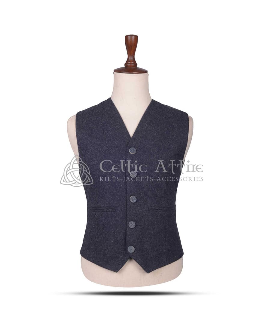 Two front welt pockets provide both style and practicality, offering space for a pocket watch or small accessories. Whether worn with a matching Argyll jacket for full Highland dress or as a standalone piece, this waistcoat brings sophistication and versatility to your wardrobe. The neutral charcoal gray shade makes it a perfect match for a wide variety of tartans, ensuring you always look coordinated and stylish.