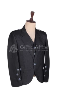 In particular this outfit is perfect for any formal occasion, such as weddings, banquets, or evening events. Pair it with a white shirt, a black tie, and classic accessories like a sporran or pocket watch for a complete look. The Charcoal Gray Wool Crail Jacket and Waistcoat pairs well with a kilt or tailored trousers, allowing for versatility and style.