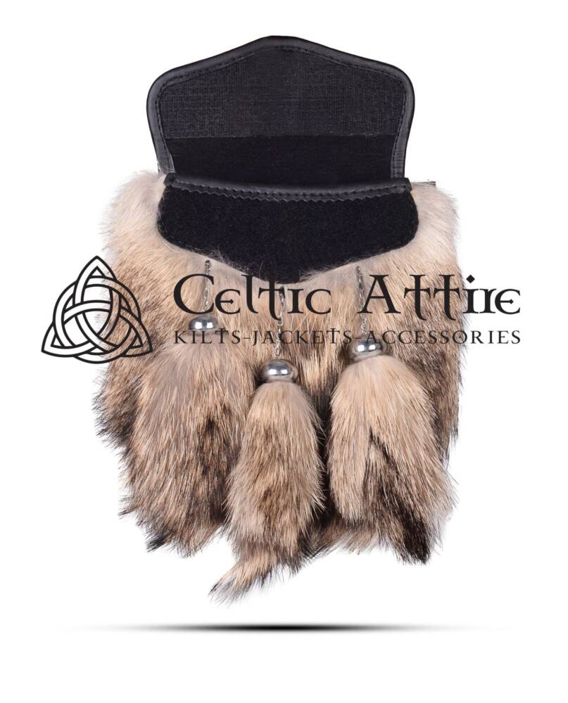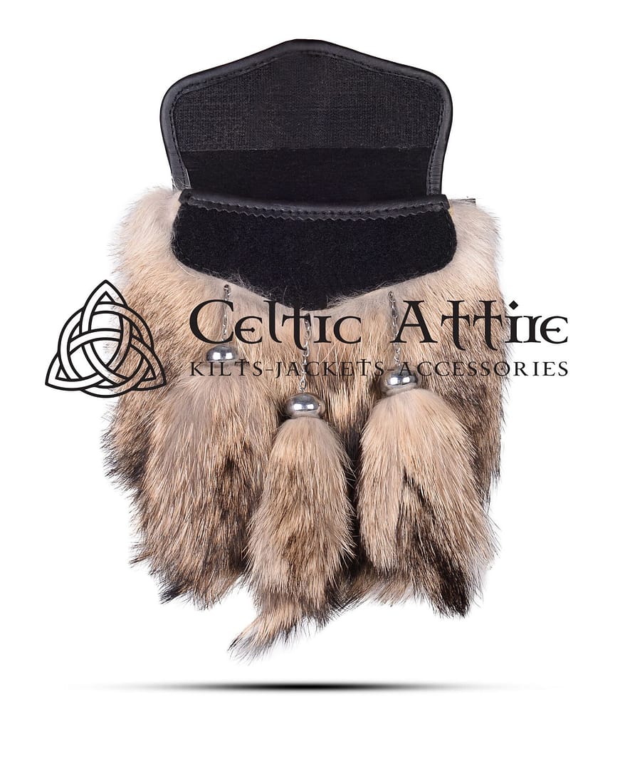 Designed for versatility, the sporran features three decorative coyote tassels with metal chains, adding movement and flair to your look. Measuring 7″ x 9″, it provides ample space for your essentials while maintaining a compact silhouette. Whether you’re attending a wedding, a festive celebration, or a formal event, the Coyote Fur Scottish Sporran is the ideal accessory to complete your outfit with a touch of Scottish charm and elegance.