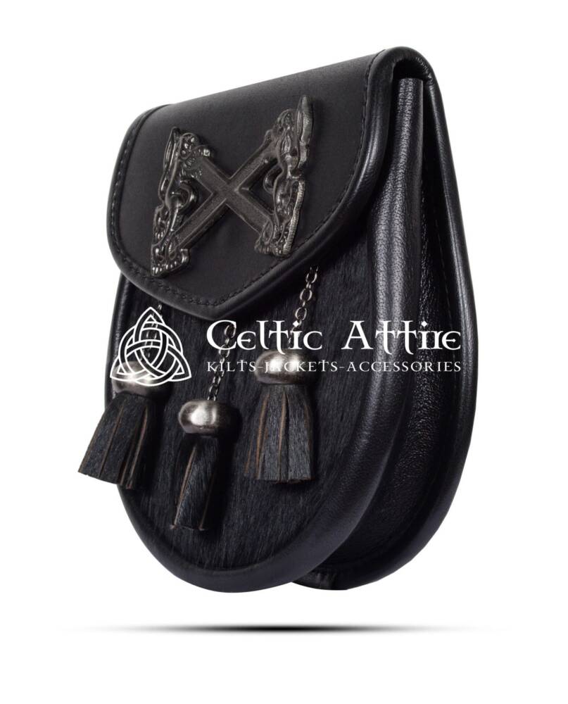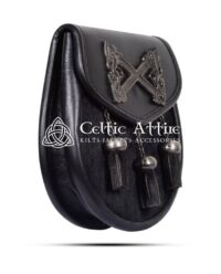 The Rampant Lions Featured Sporran is a sophisticated accessory that combines traditional Scottish symbolism with modern elegance. It’s crafted from premium black leather. This sporran features a striking emblem showcasing a rampant lion and a cross. That is an iconic symbol of Scottish heritage and pride.