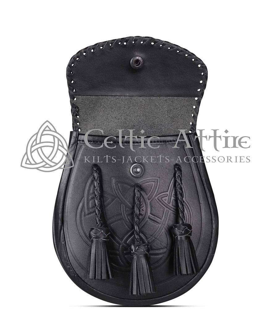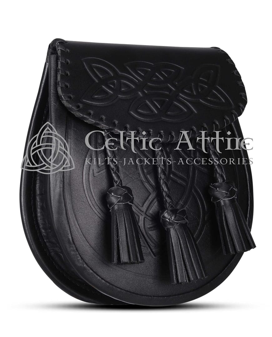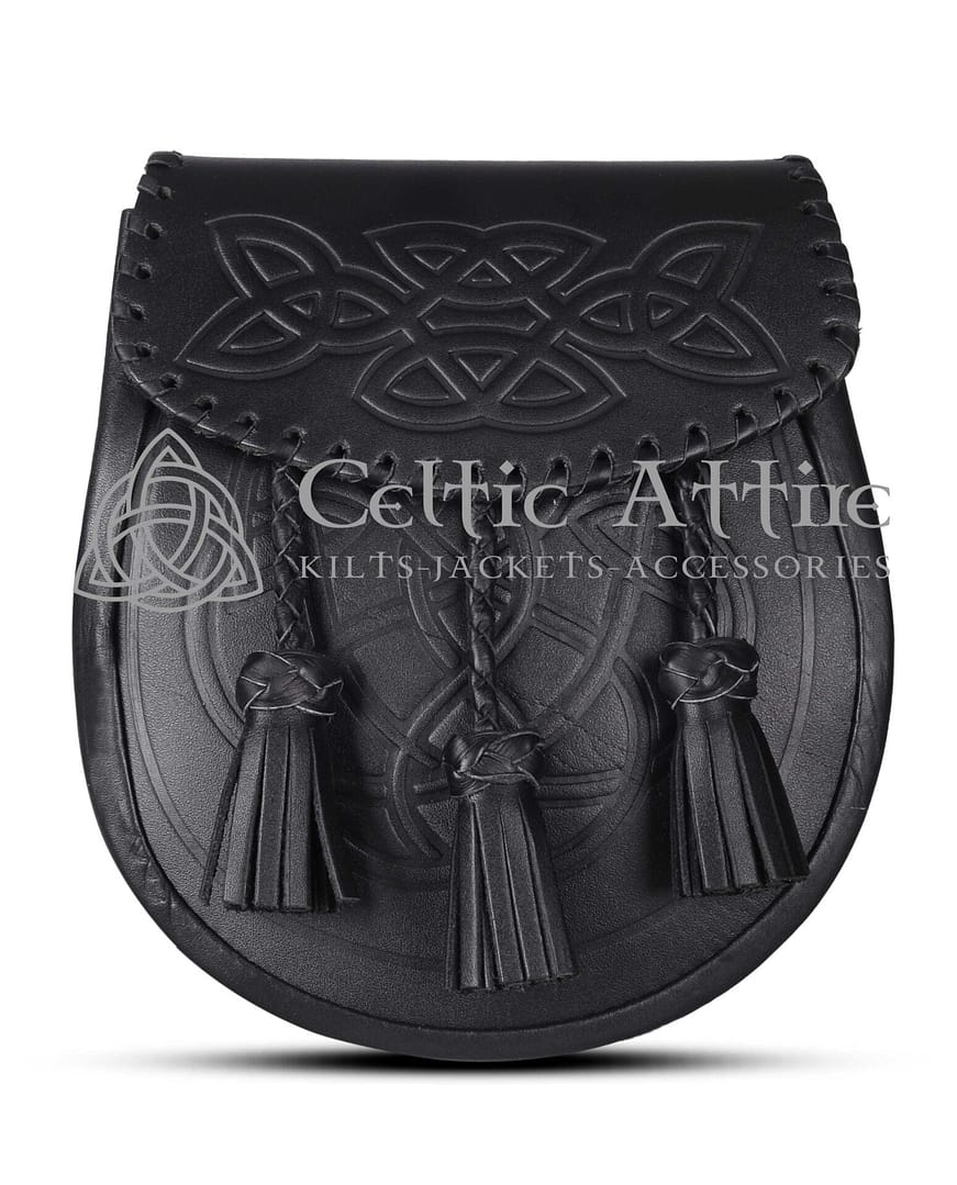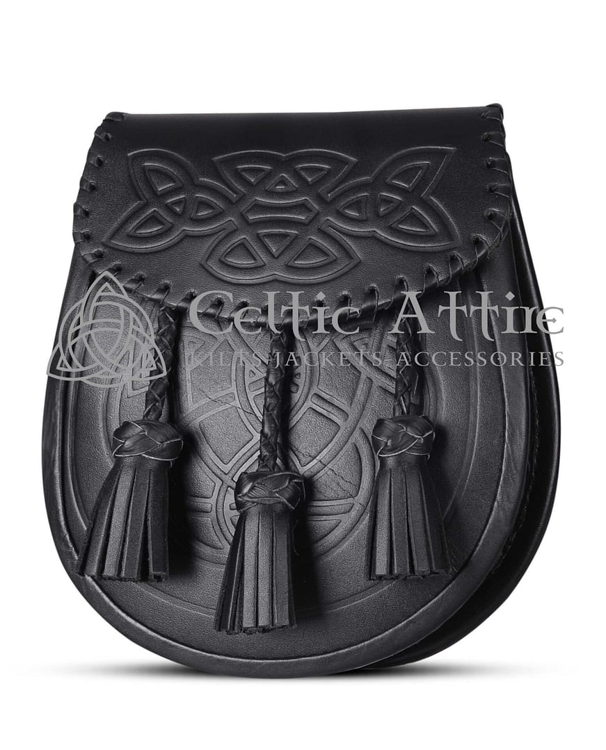 The Embossed Black Leather Day Sporran is a striking accessory combining traditional Scottish craftsmanship and modern elegance. Crafted from genuine black leather, this sporran features a beautifully embossed Celtic design that adds depth and texture to its appearance.
