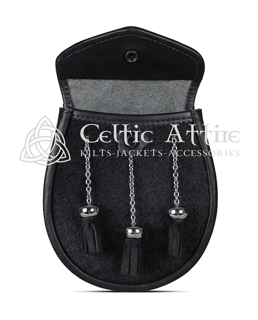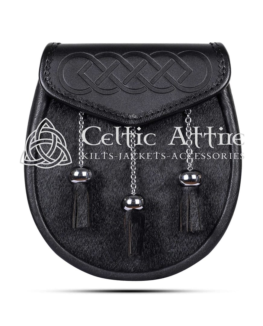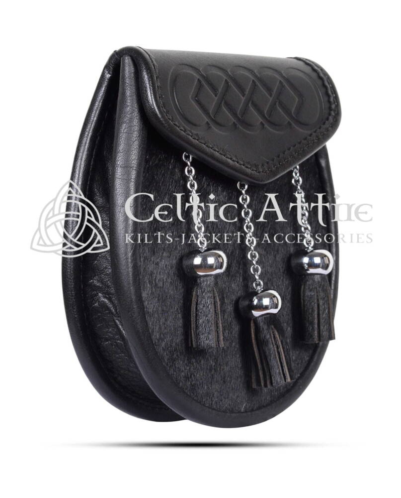 The Black Semi Dress Sporran is the most loved all-time best seller in the category. It’s equipped with bovine fur, a beautiful Celtic Knots Embossed Pattern, and three silver chrome tassels. An accessory that seamlessly blends traditional Scottish craftsmanship with contemporary design elements. Made from high-quality black bovine fur, this sporran features black bovine fur tassels. Celtic Knots embossed flap adds a unique touch to your Scottish kilt ensemble. The combination of luxurious fur and detailed embossing not only enhances its aesthetic appeal but also reflects the rich cultural heritage of Scotland.