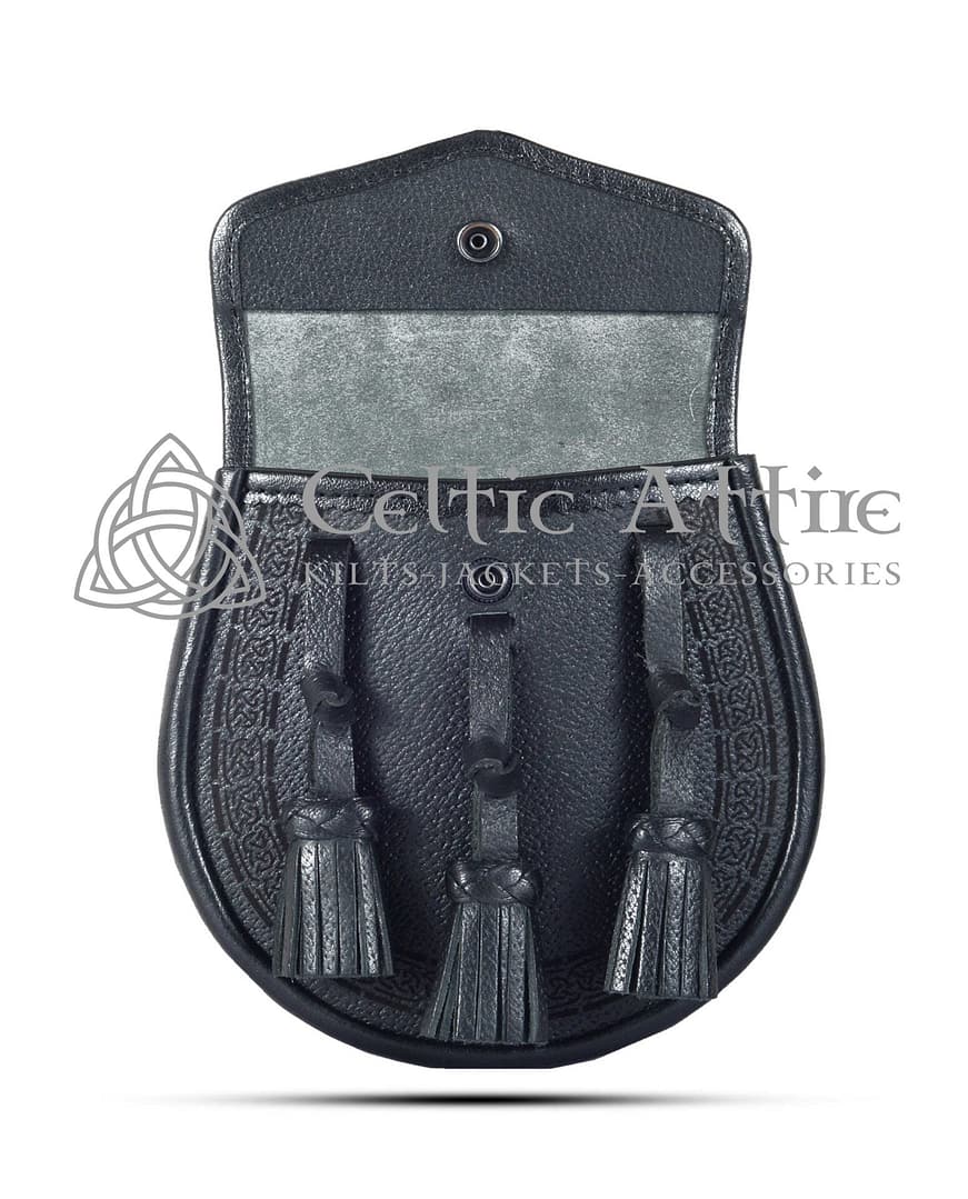 The elegant design includes three hand-pleated tassels, which enhance its traditional Scottish appeal. With a spacious interior compartment, the Embossed Black Leather Day Sporran provides ample storage for your essentials like keys, wallet, and phone. The secure closure ensures that your belongings remain safe while you wear it.
