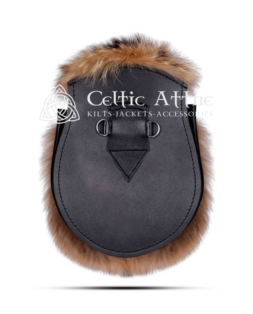 The front flap is crafted from authentic coyote fur, providing a luxurious appearance. This combination of materials makes the sporran both functional and stylish.