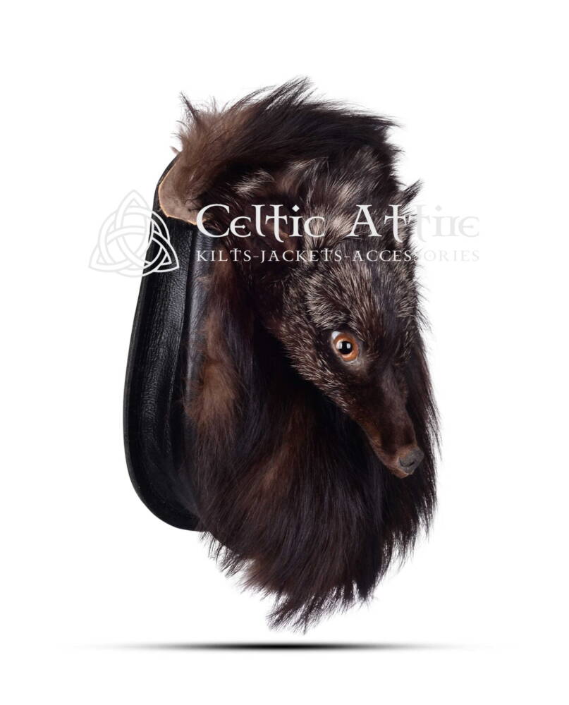 The Full Mask Dark Brown Coyote Sporran is a stunning accessory that adds a touch of elegance to any kilt outfit. This sporran features a full mask design made from genuine dark brown coyote fur, showcasing the material’s rich color and soft texture.Â