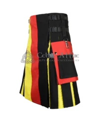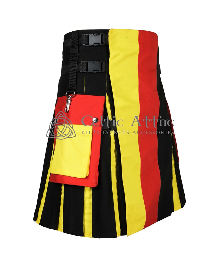 The German Flag Utility Kilt is a standout piece for those who want to combine patriotism with functionality. Featuring the striking black, red, and gold colors of the German flag. This kilt makes a bold statement while offering the practicality you need for everyday wear.