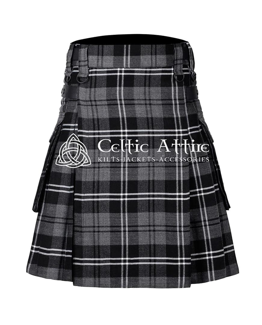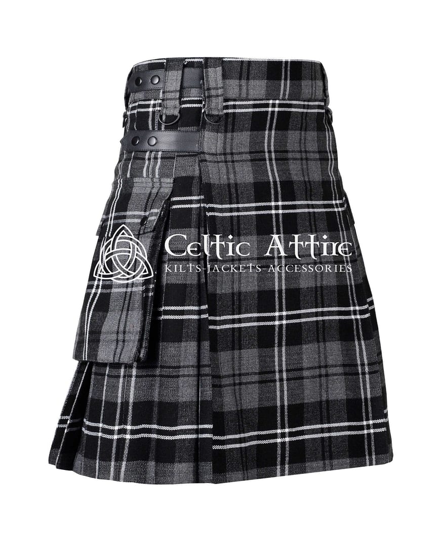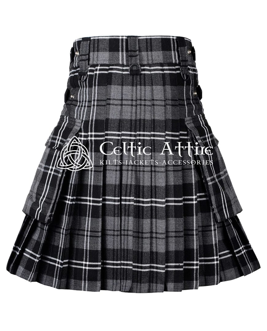 The Granite Tartan Utility Kilt showcases a sophisticated blend of traditional design and modern functionality. Featuring a striking granite tartan pattern, it presents shades of grey, black, and subtle colors, making it a versatile addition to any wardrobe. This kilt appeals to those who appreciate classic style with a contemporary edge.
