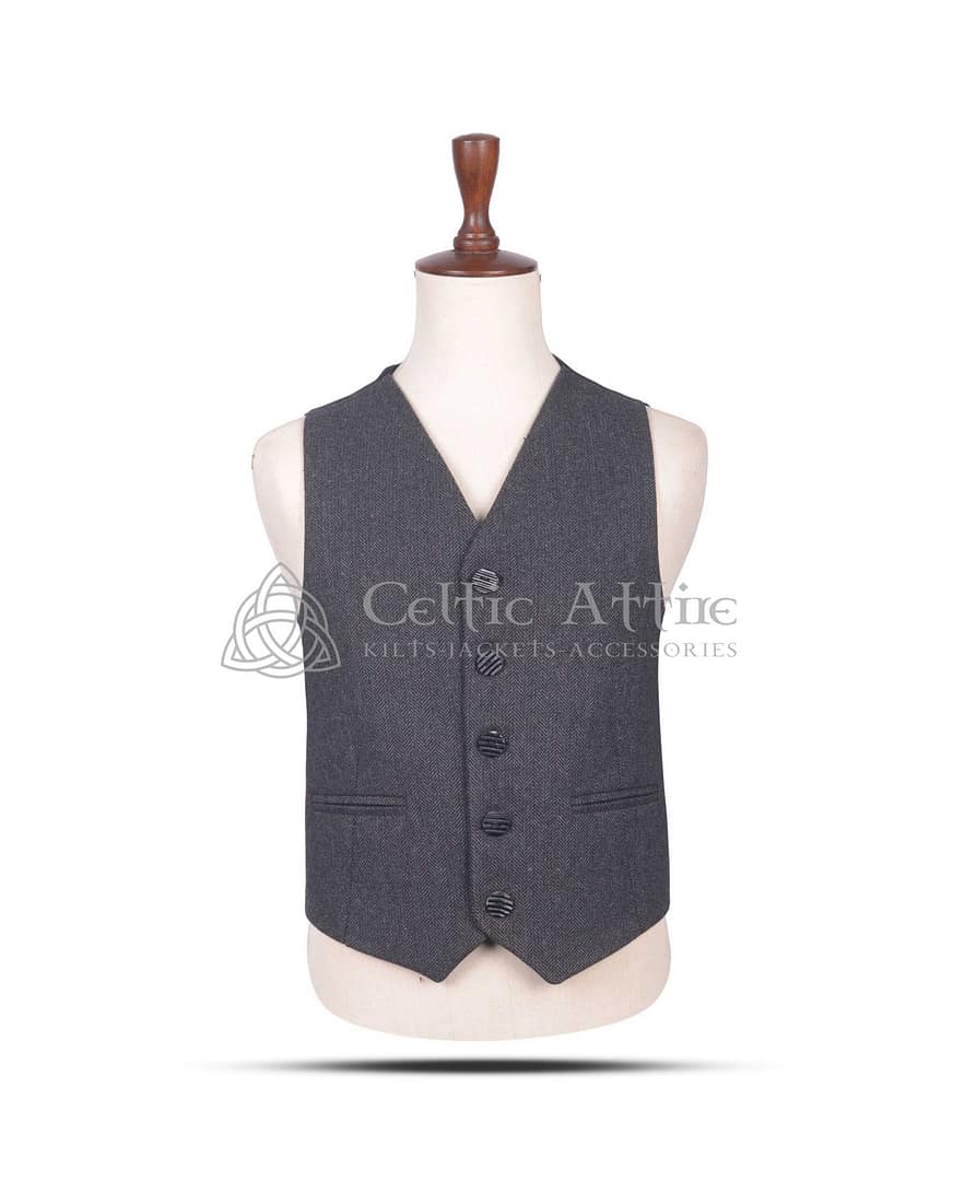 Introducing the Gray Tweed 5-Button Argyll Vest, a versatile and stylish piece designed for those who appreciate classic Highland wear with a modern twist. This sleek, tailored vest combines the timeless elegance of tweed with the traditional Argyll style, making it a must-have for formal occasions, weddings, and other distinguished events.