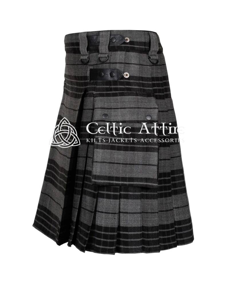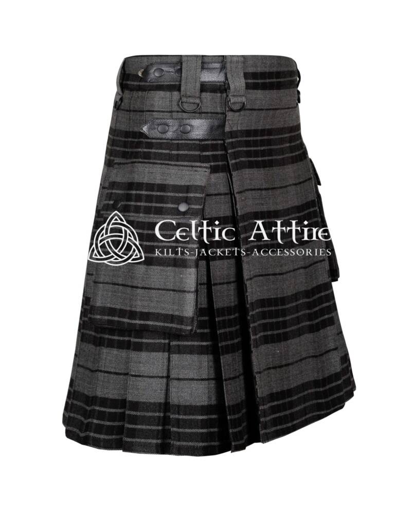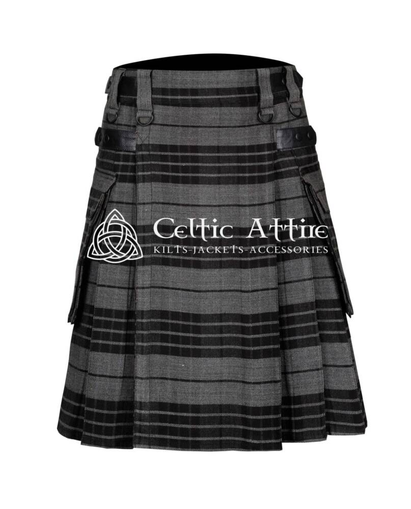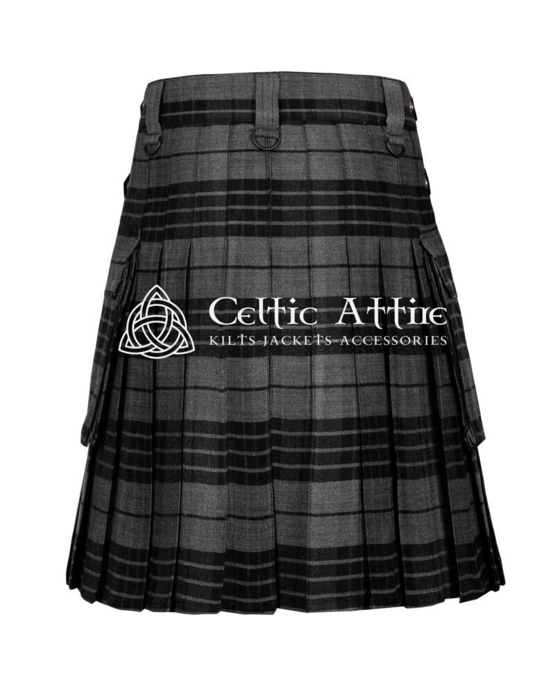 Functionality shines in the Gray Watch Tartan Utility Kilt. It includes multiple spacious pockets, providing ample room for essentials like your phone, wallet, and tools. These pockets integrate seamlessly into the kilt’s design, allowing you to carry your items securely without sacrificing style.