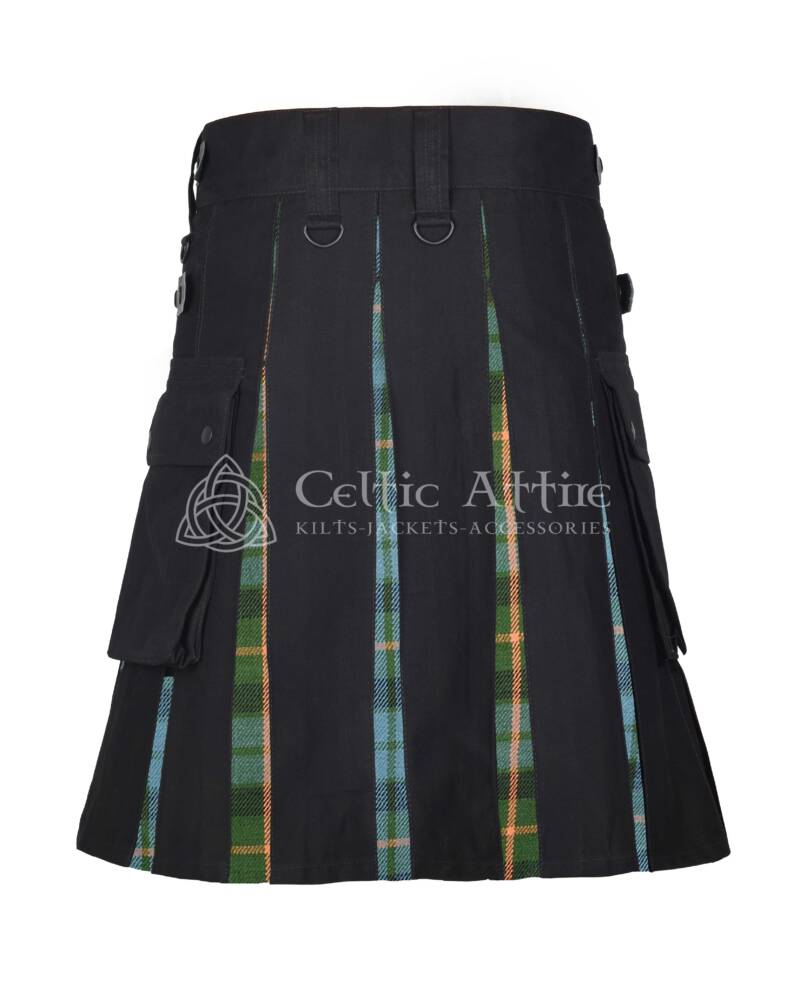 The kilt includes reinforced belt loops to accommodate utility belts or accessories, and the adjustable leather straps and snap front closure allow for a secure, tailored fit. The pleated tartan back retains the traditional look, while the sturdy cotton front adds a modern, functional twist.