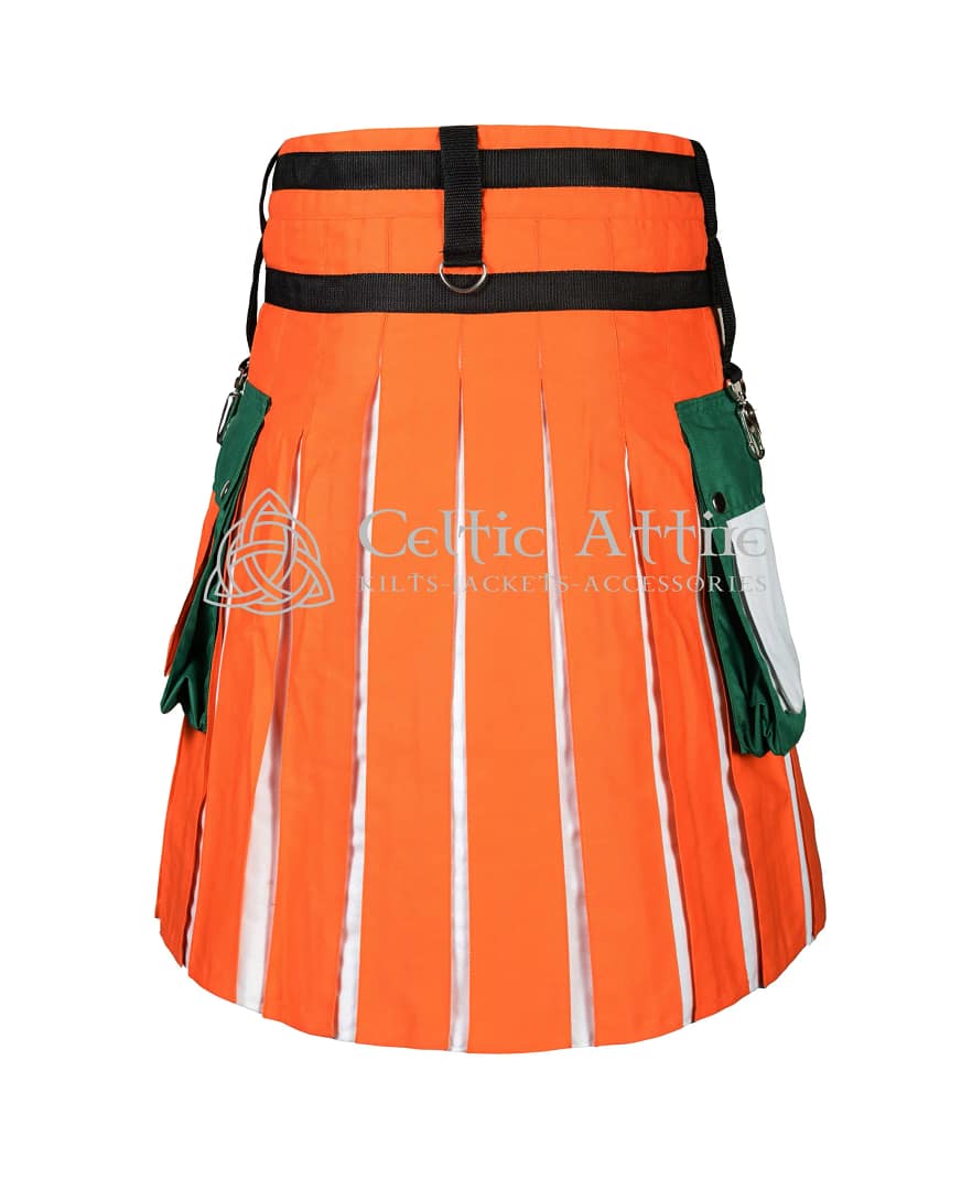The Ireland Flag Utility Kilt combines patriotism with practicality, offering a stylish way to showcase your Irish pride. Featuring the vibrant green, white, and orange of the Irish flag, this kilt is designed for those who want to stand out while enjoying comfort and functionality.