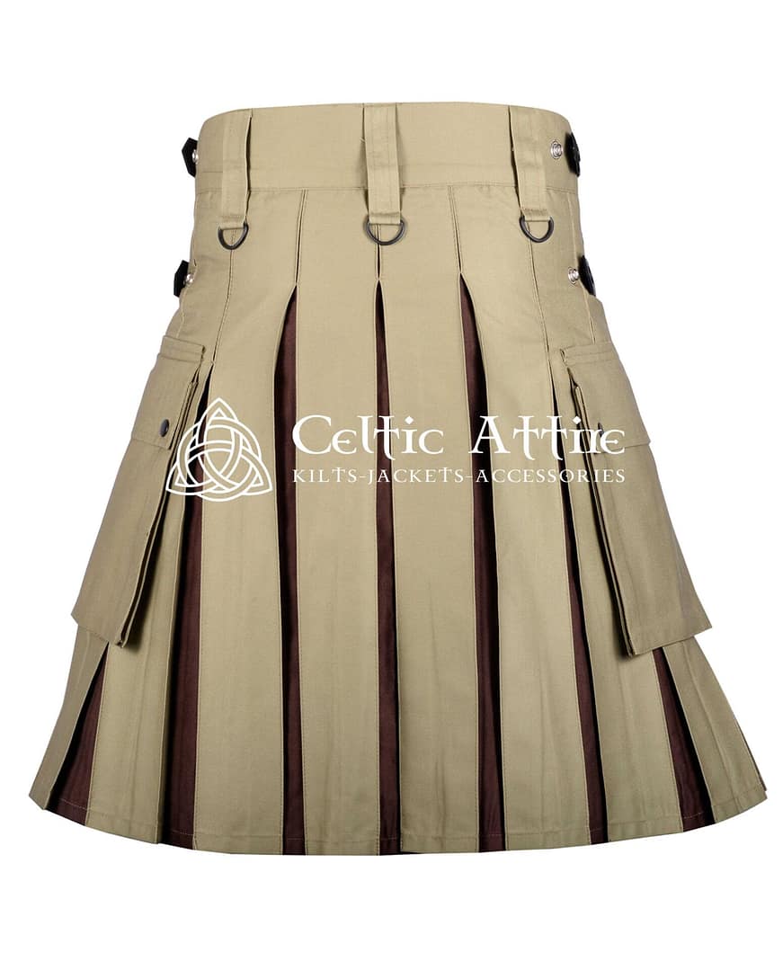 Overall, this kilt combines fashion, comfort, and functionality. It is perfect for anyone looking to honor their roots while enjoying modern fashion. Whether you are celebrating a special occasion or enjoying a day out, this kilt is a great choice. With its eye-catching colors and practical features, it will leave a lasting impression. Enjoy comfort and style with the Khaki and Brown Cotton Hybrid Utility Kilt. It is an essential addition to any wardrobe.