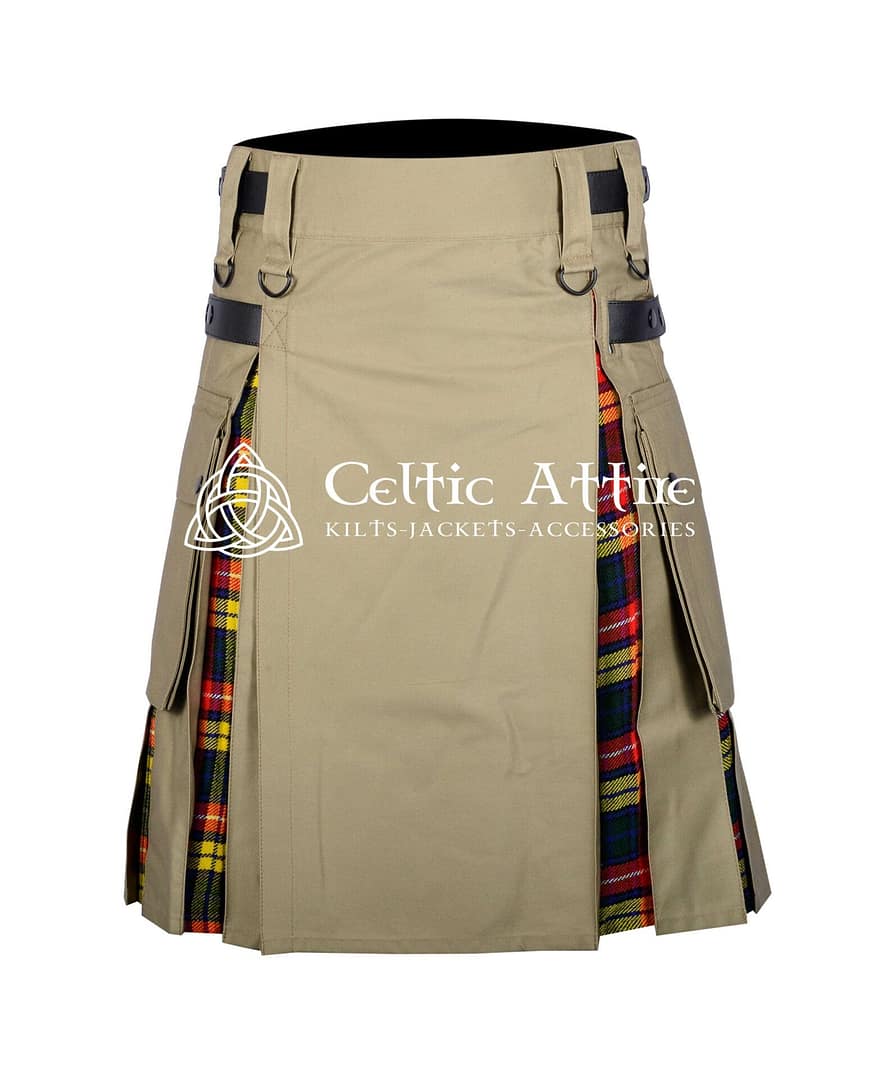 Overall, the Khaki Cotton Buchanan Tartan Hybrid Kilt combines style and functionality. It is a fantastic addition to any wardrobe. Whether you want to embrace your roots or find a fashionable piece, this kilt is an excellent choice. Its comfortable fit and striking design make it perfect for expressing individuality while honoring tradition.