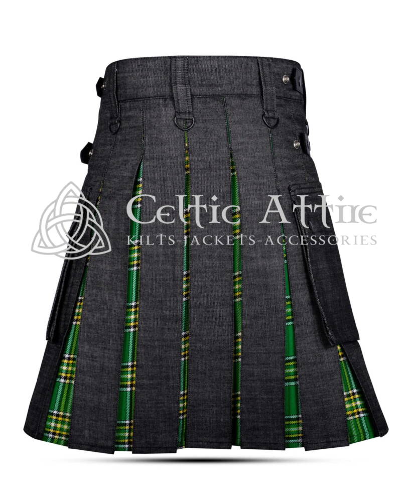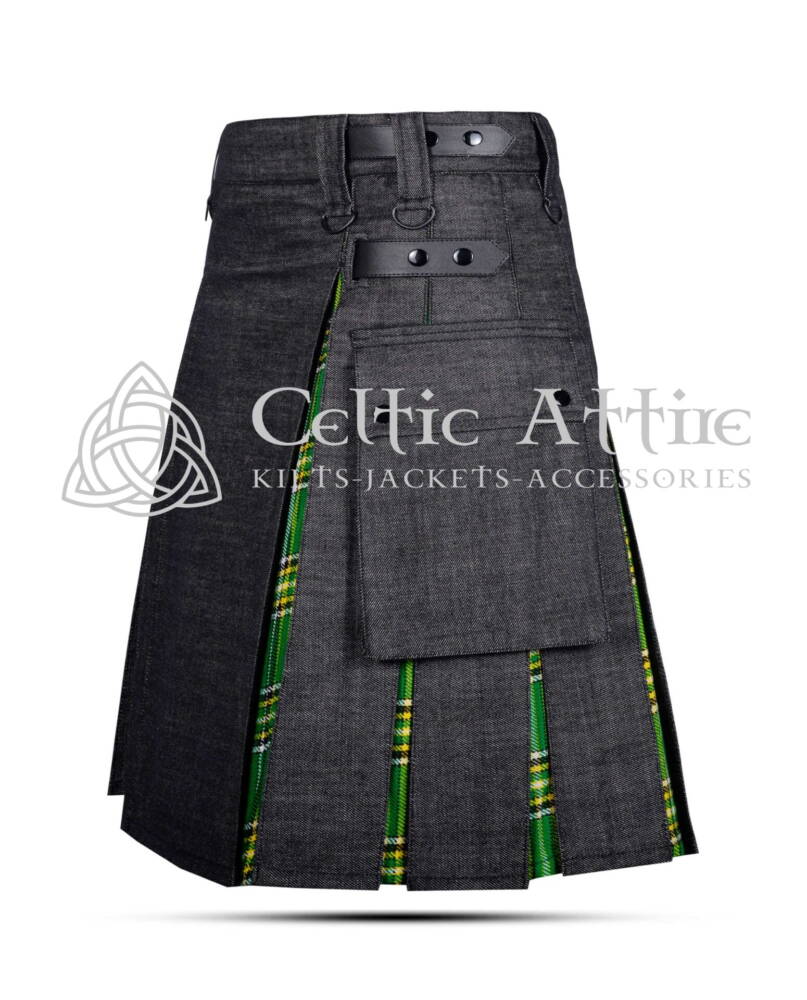 As a member of Krewe of Shamrock, you enjoy special discounted prices on kilts and related accessories. And as a loving touch of care and loyalty, any sort of customization will be free of cost. Celtic Attire has designed special Kilts and accessories for the Krewe that you can explore on this single page. This listing is for Krewe of Shamrock Black Denim Hybrid Utility Kilt, which is crafted with premium-grade soft raised canvas fabric. It’s equipped with Irish National Tartan Under Pleats and 2 side Cargo Pockets. Leather Straps offer size adjustment up to 2 inches up and down.