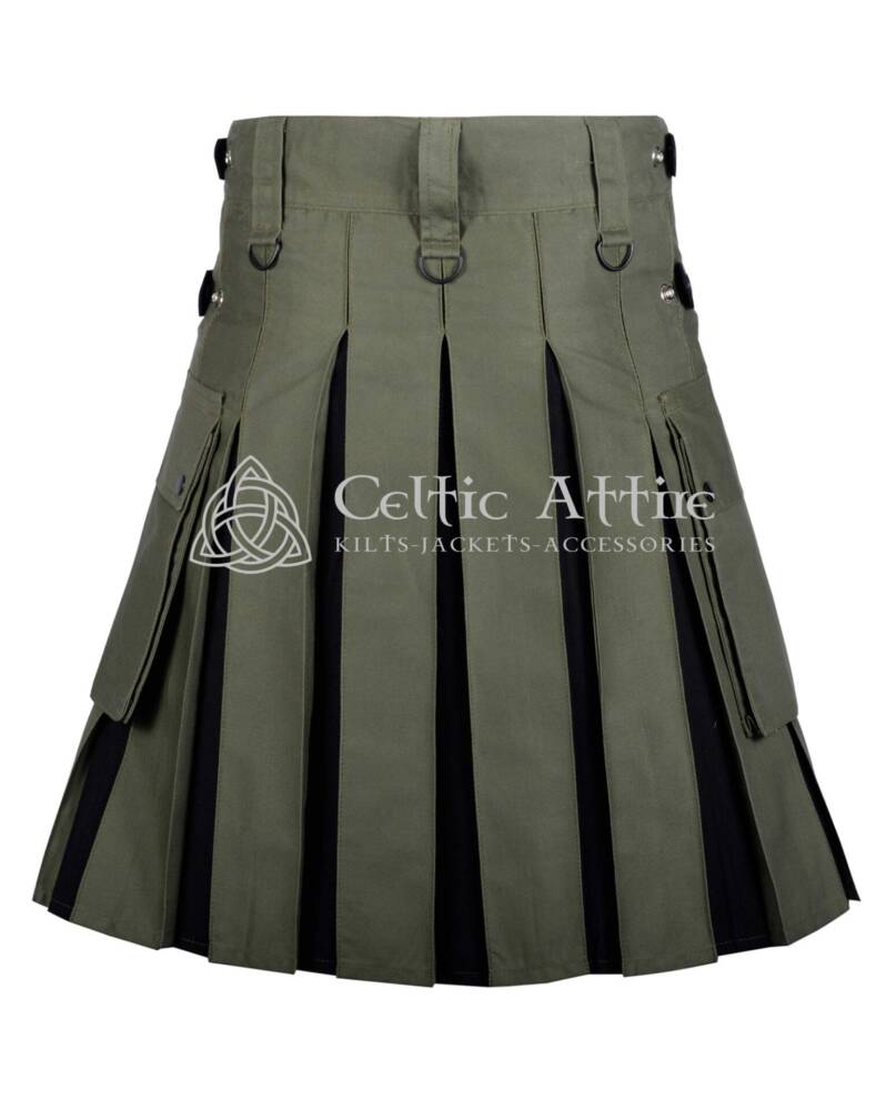 In addition to its practical features, this kilt celebrates Scottish heritage with its distinctive tartan pattern. The black tartan adds a touch of elegance to the olive green fabric, making it a standout piece in any wardrobe.