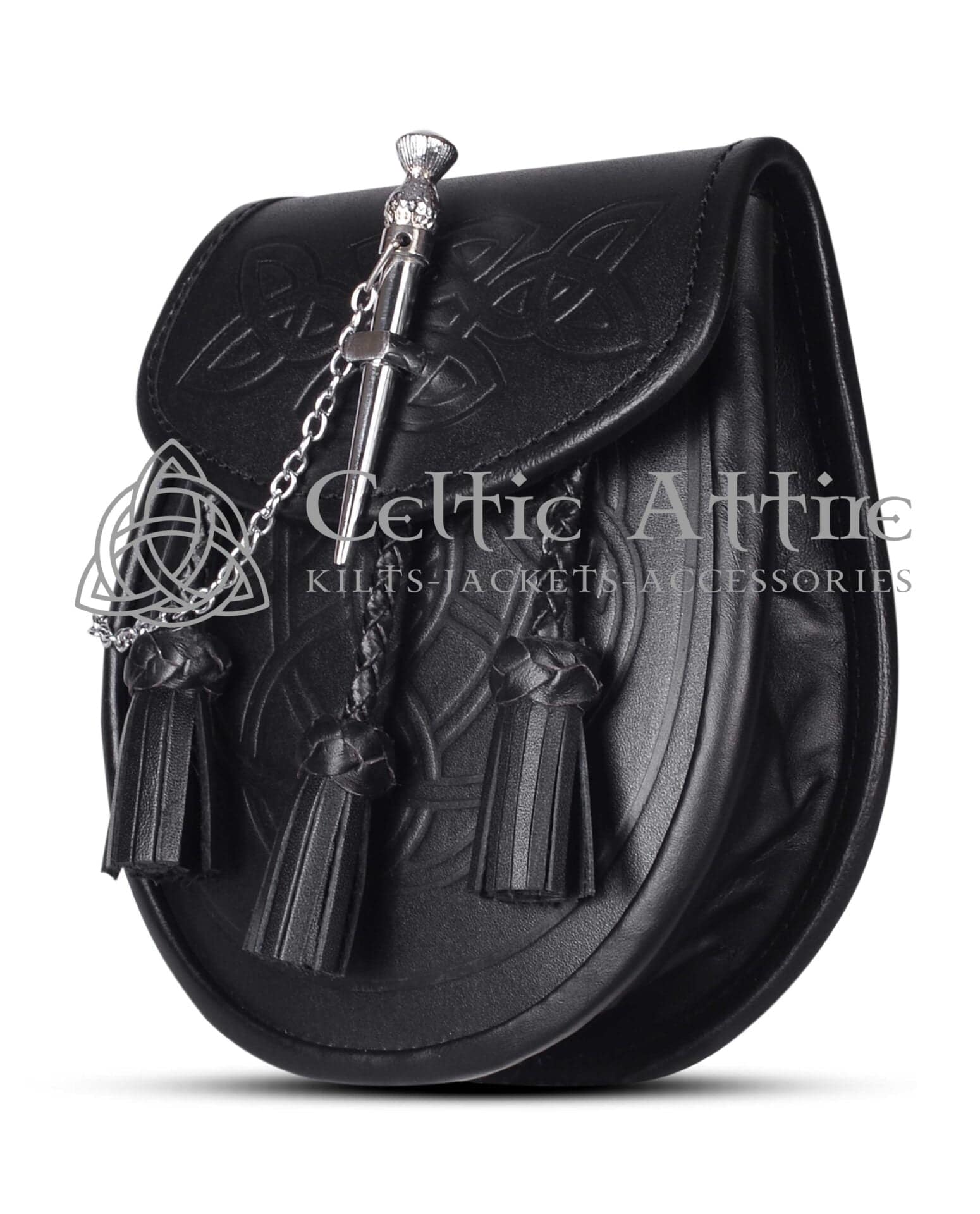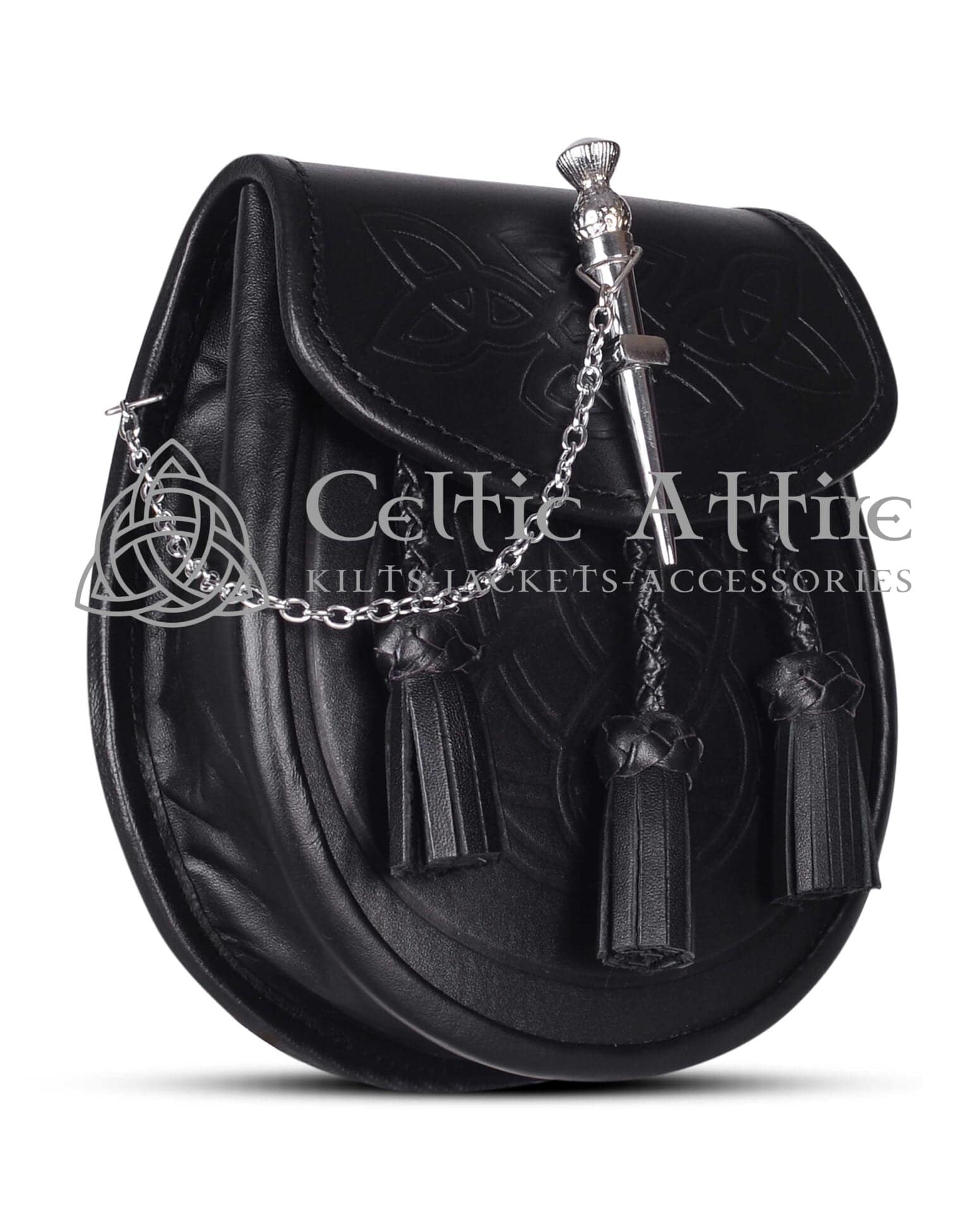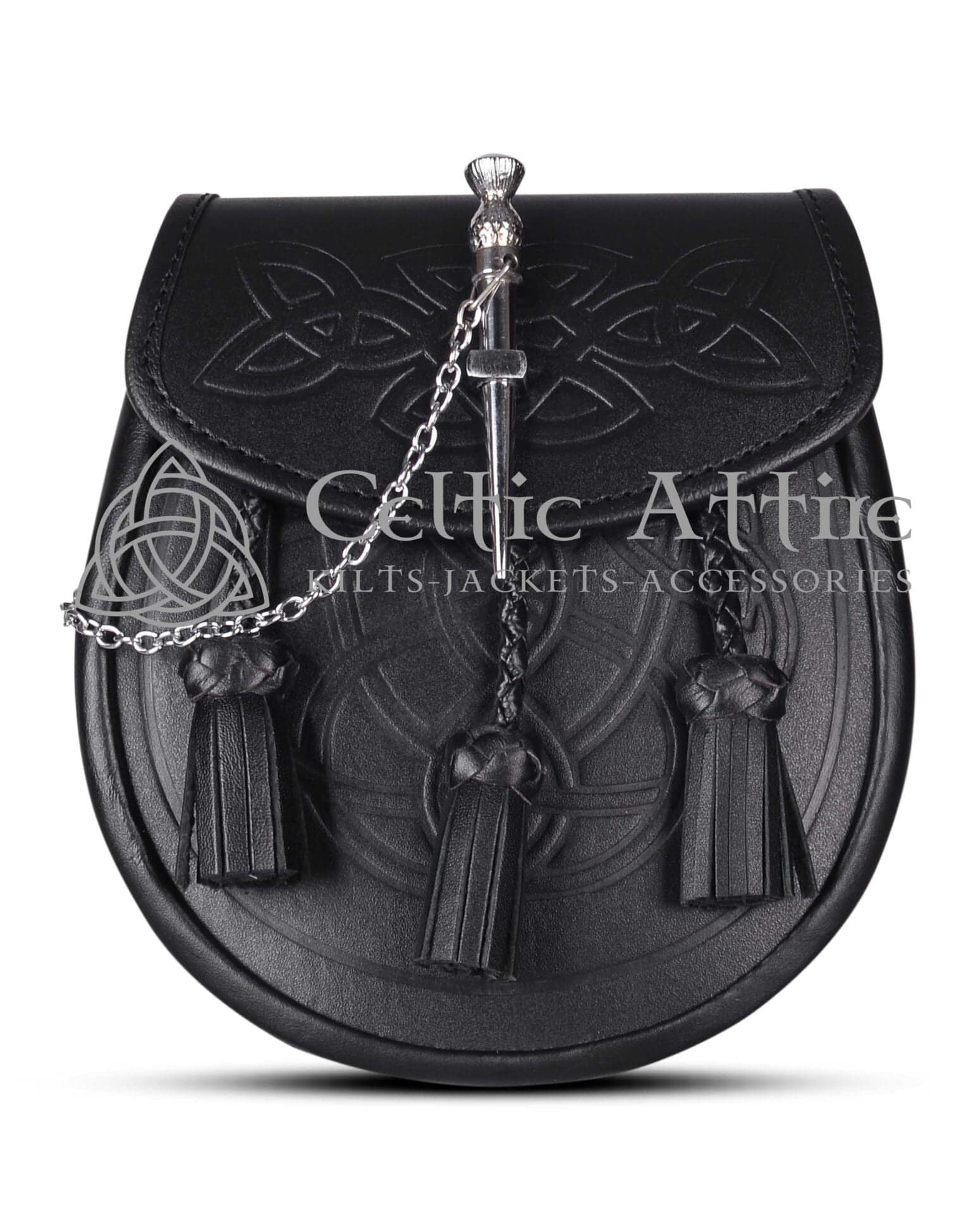 The Pin Lock Day Sporran is a stylish and functional accessory that enhances any kilt outfit. Made from high-quality black leather, it features an elegant embossed Celtic design that adds a touch of sophistication. The intricate embossing is visible on both the flap and the body, showcasing exceptional craftsmanship.