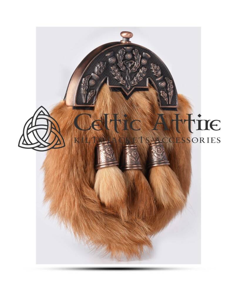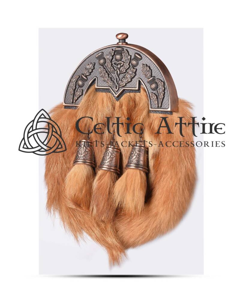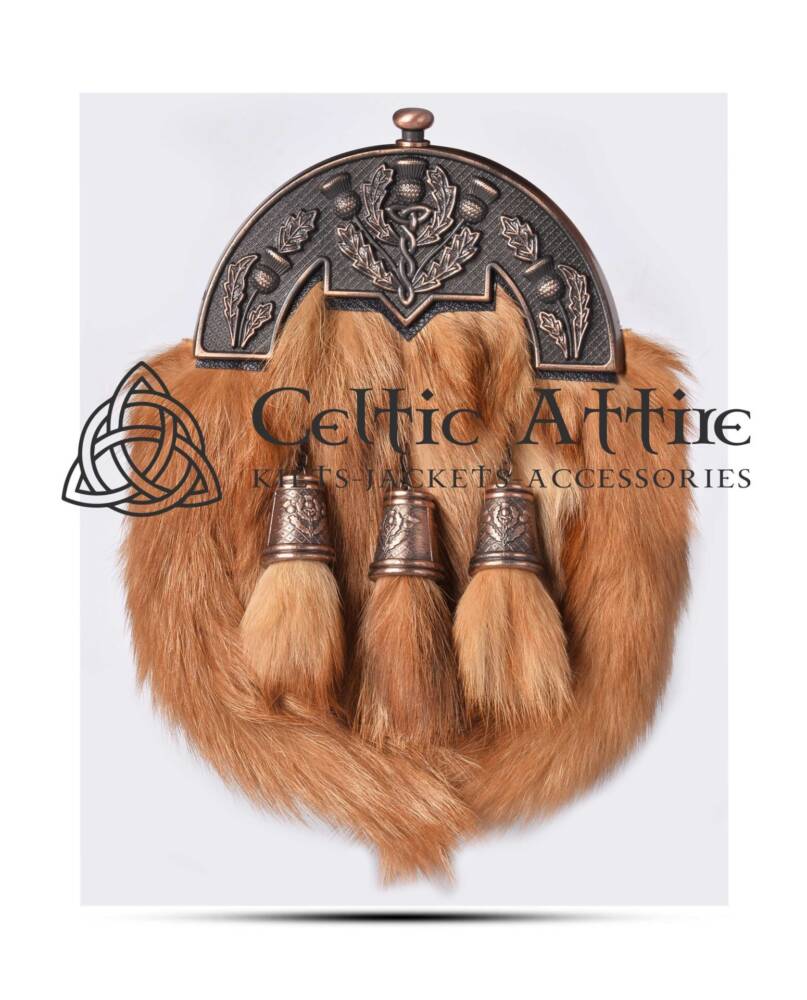 This Bronze Thistle Fox Fur Sporran is ideal for weddings, Highland games, and other ceremonial events. Functionality is key with this sporran. It offers ample storage space for your essentials, ensuring you have everything you need at hand. The interior is lined with soft suede, featuring pockets for cards and coins. A durable leather back enhances its longevity, making it a reliable choice for any occasion. The  Fox Fur Sporran comes with a matching chain strap for easy attachment to your kilt. Three elegant tassels hang from the front, adding a classic touch that enhances its overall charm. Its versatile design allows it to pair beautifully with various kilts and formal wear, making it a must-have for anyone who appreciates quality and style.